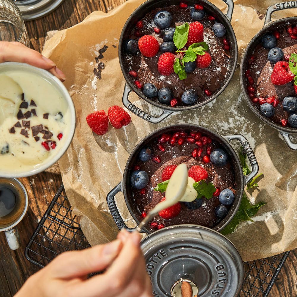De Staub producten zijn vervaardigd uit gietijzer van zeer goede kwaliteit met verhoogde weerstand tegen krassen en chippen ze zijn gemakkelijk schoon te maken en met een lange levensduur. Door de gebruikte materialen houden de kookpotten hun temperatuur op temperatuur en houden ze zichzelf warm lang nadat ze uit de oven zijn gehaald of van de kookplaat zijn gehaald. Naast deze technische kwaliteiten maakt hun aantrekkelijke uiterlijk het mogelijk om het eten aan tafel te serveren, rechtstreeks van het kookgerei, onmiddellijk nadat ze van de kookplaat zijn gehaald.