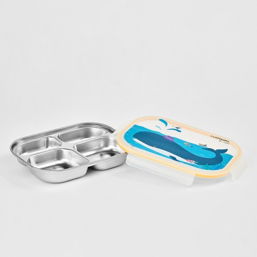Rechthoekige, gecompartimenteerde voedselopslagcontainer geproduceerd door Cuitisan, met een inhoud van 500 ml, afmetingen 24,5 x 18,5 x 5,5 cm, gemaakt van Cromosteel roestvrij staal, met een deksel van polypropyleen.