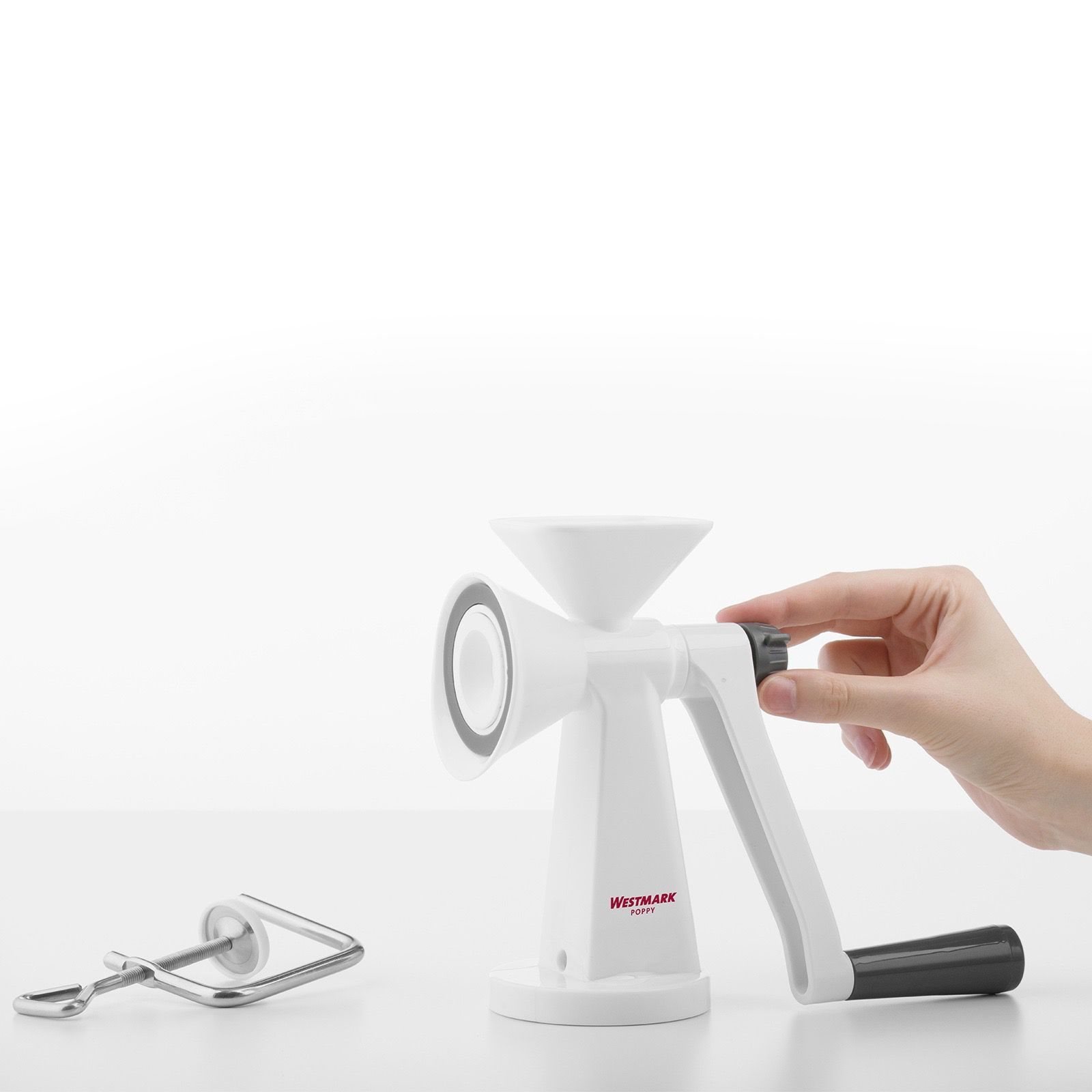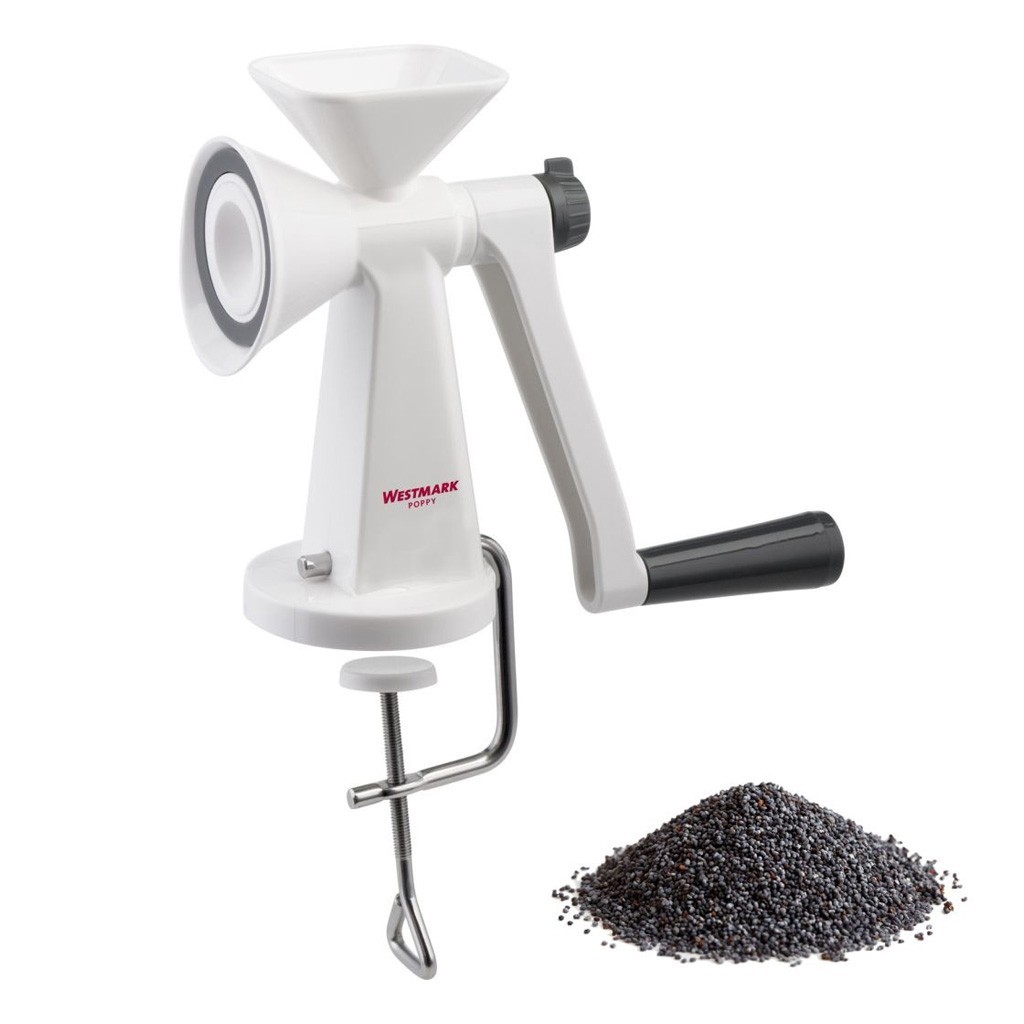Handmolen voor maanzaad, gemaakt door Westmark. Het product kan ook gebruikt worden om andere soorten zaden te malen. Dit product wordt vooral aanbevolen voor vette zaden, zoals lijnzaad, sesam, chia of quinoa.