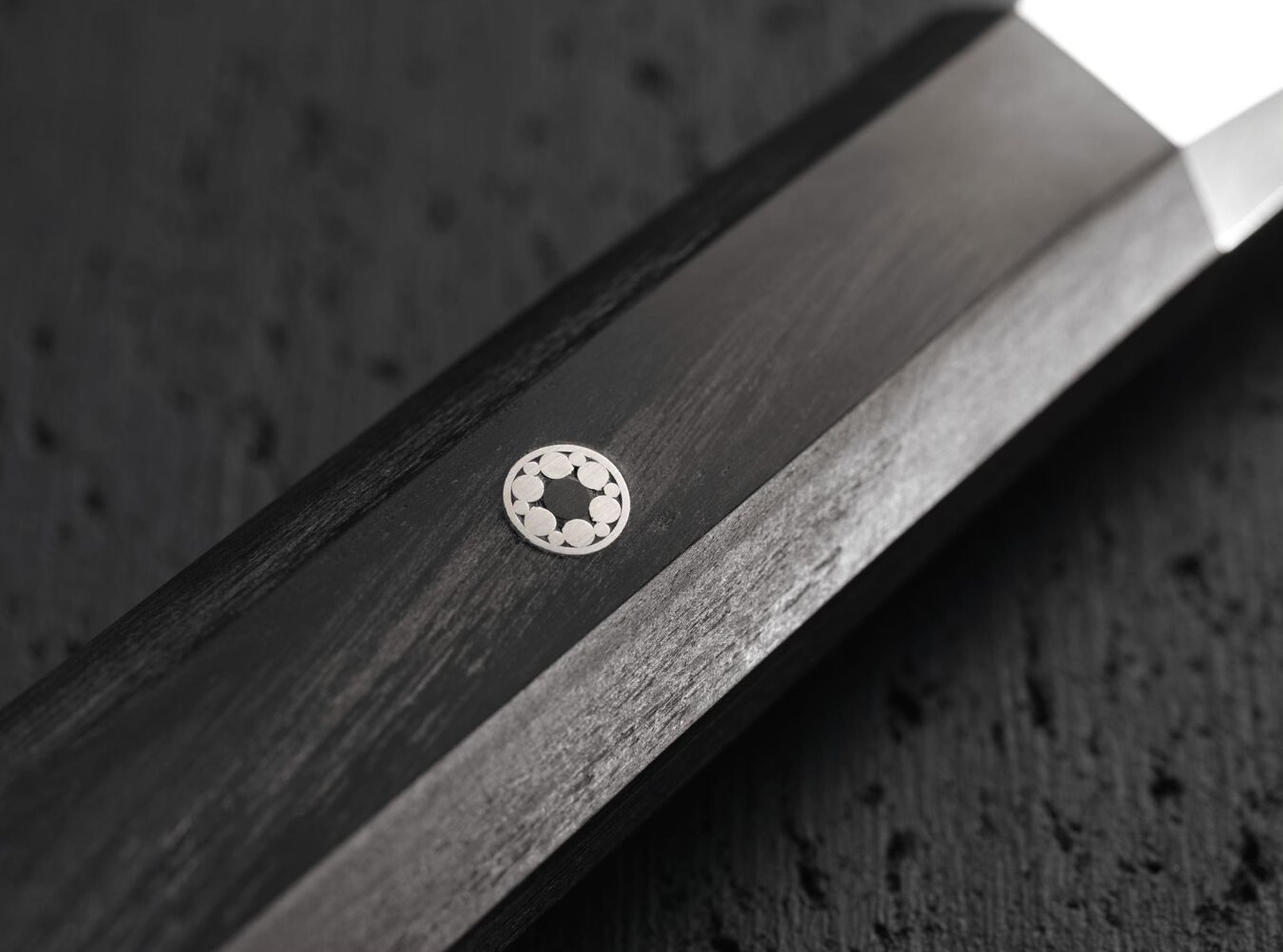 - Het handvat bevat een decoratieve klinknagel die zowel sterkte als een verfijnde en nobele touch aan dit mes geeft;