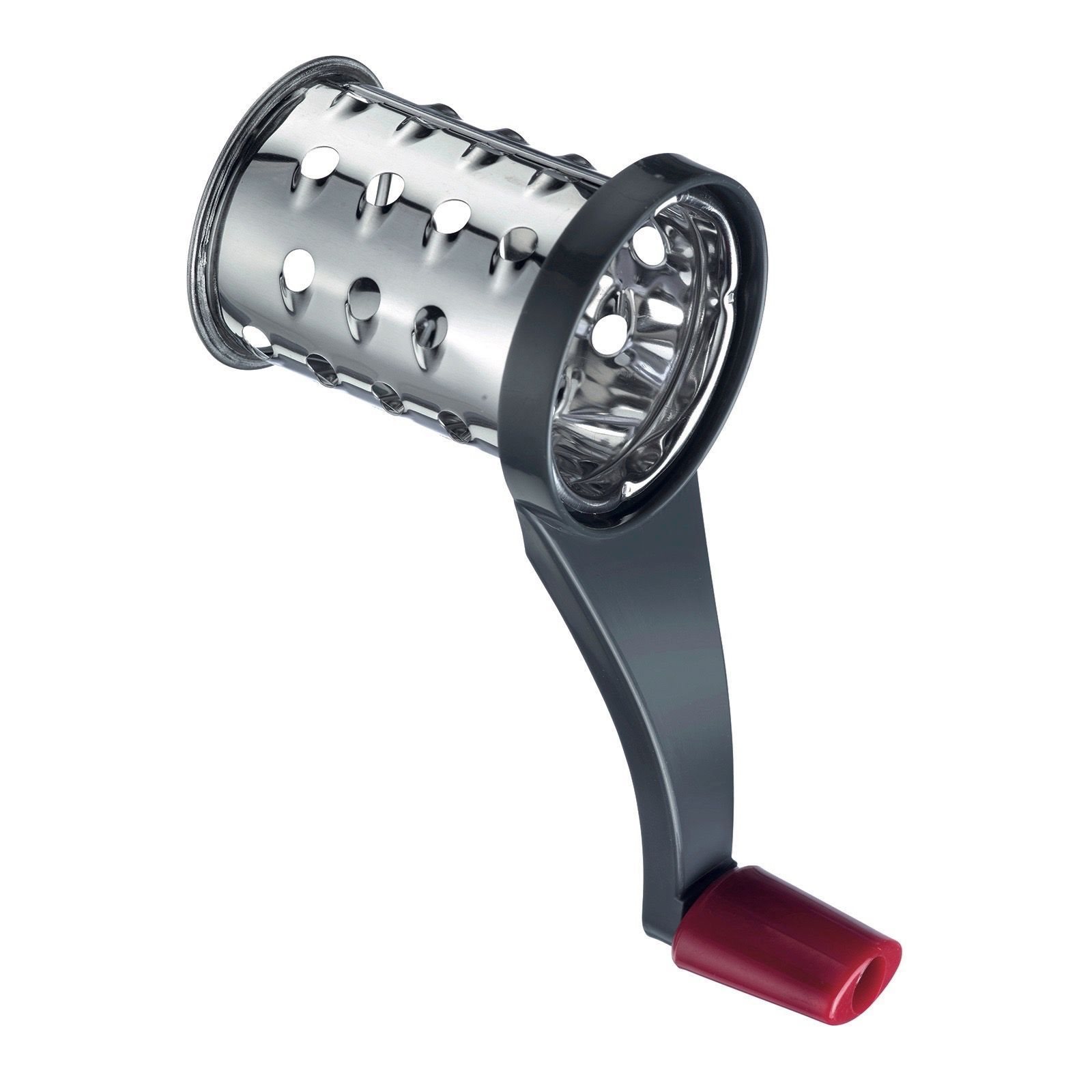 Handslingerrasp, merk Westmark, voorzien van 3 afneembare roestvrijstalen rasptrommels die geschikt zijn voor het grof of fijn raspen van amandelen, walnoten, chocolade, fruit, groenten.