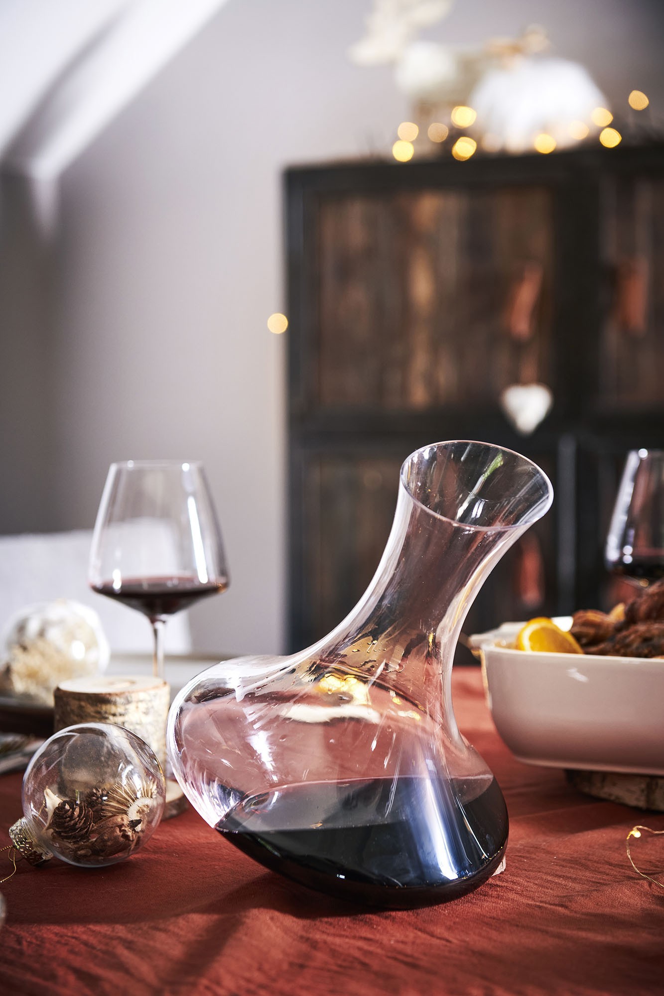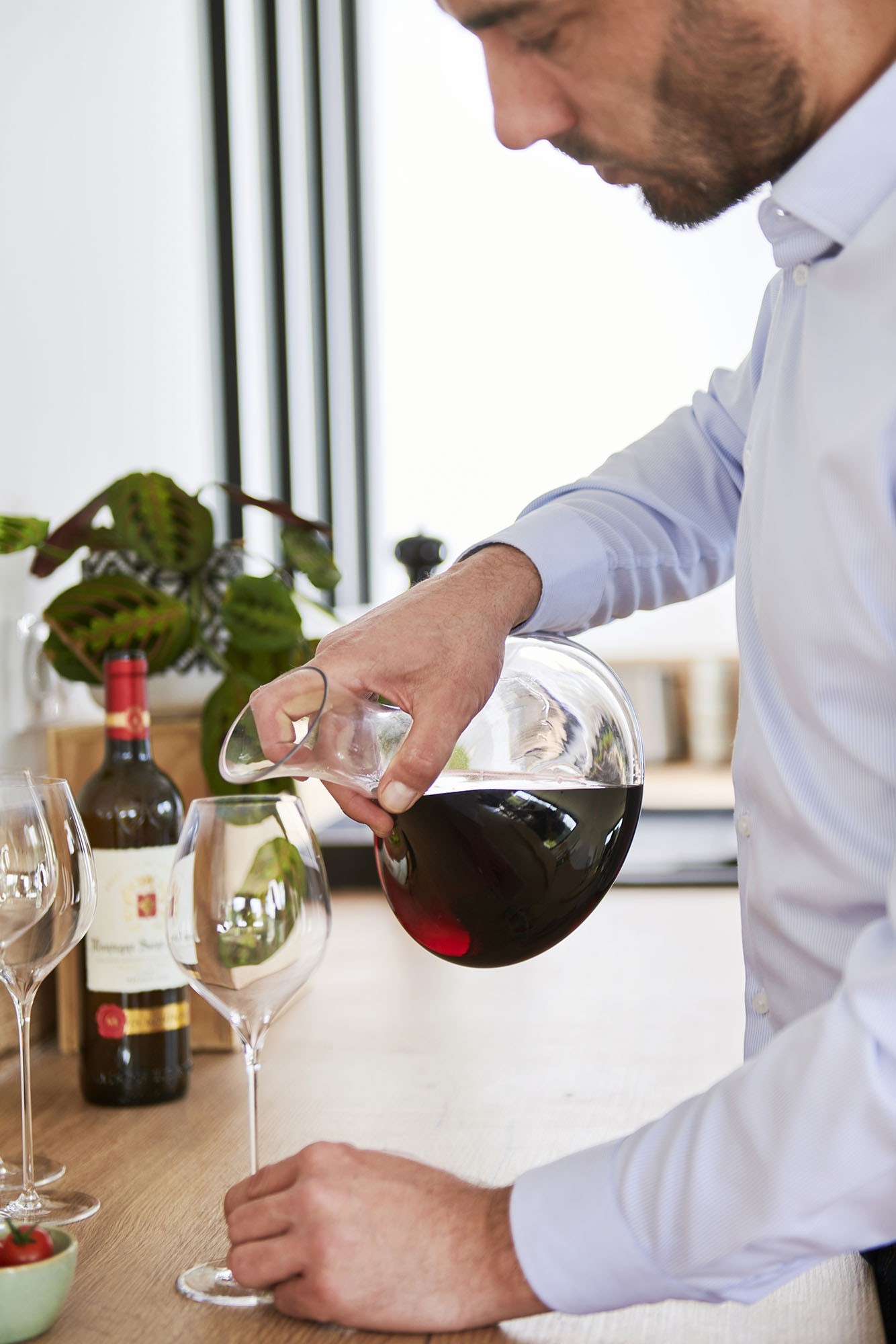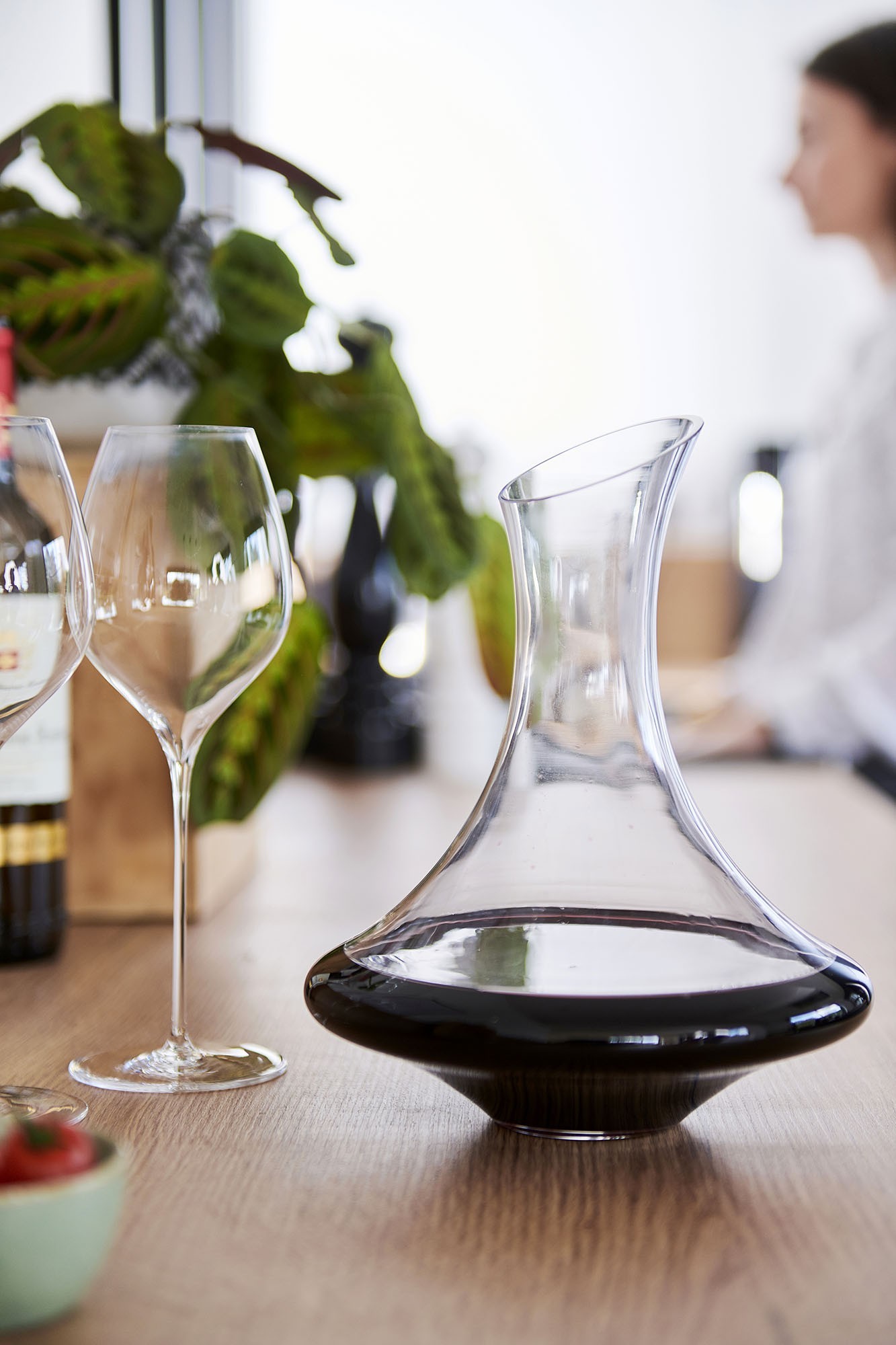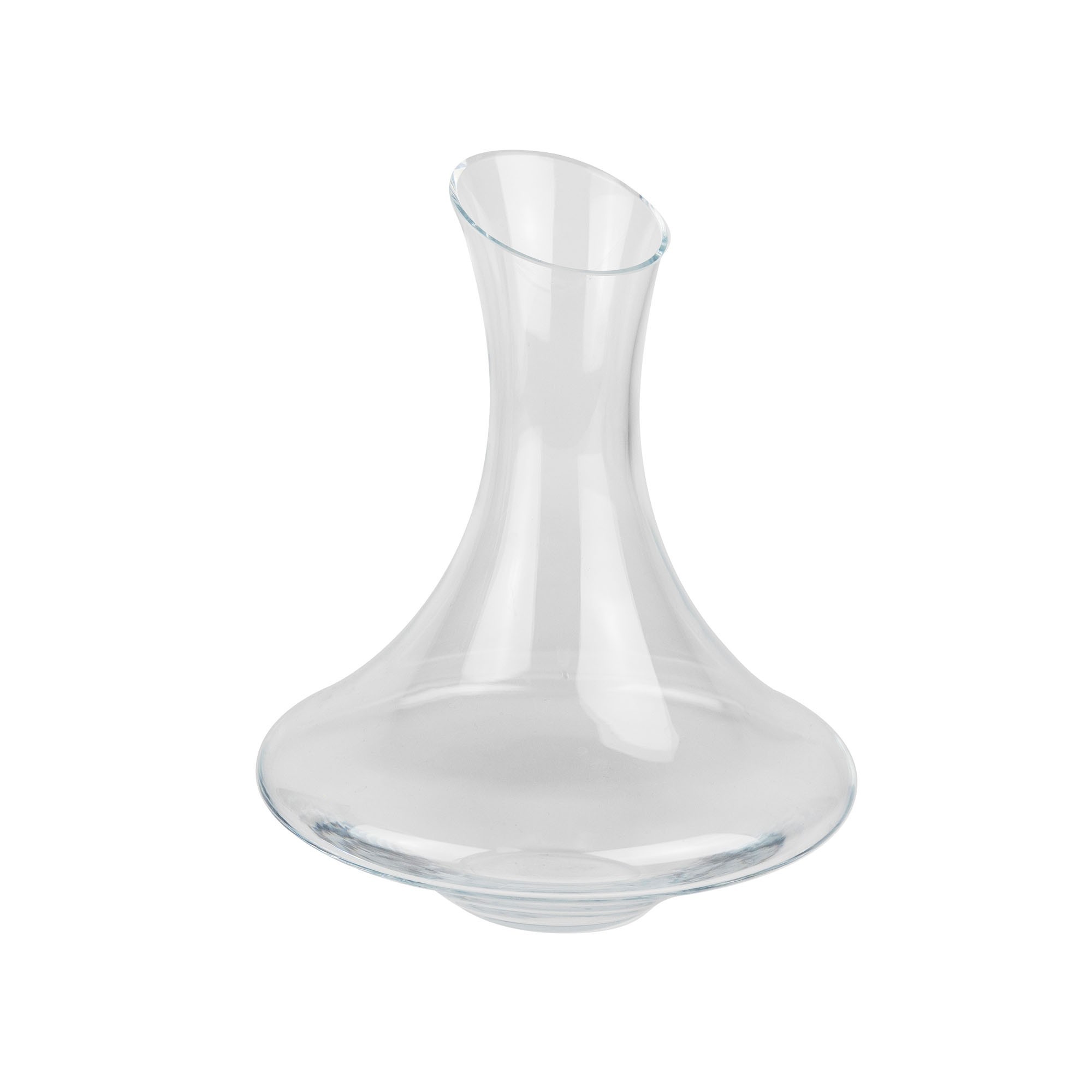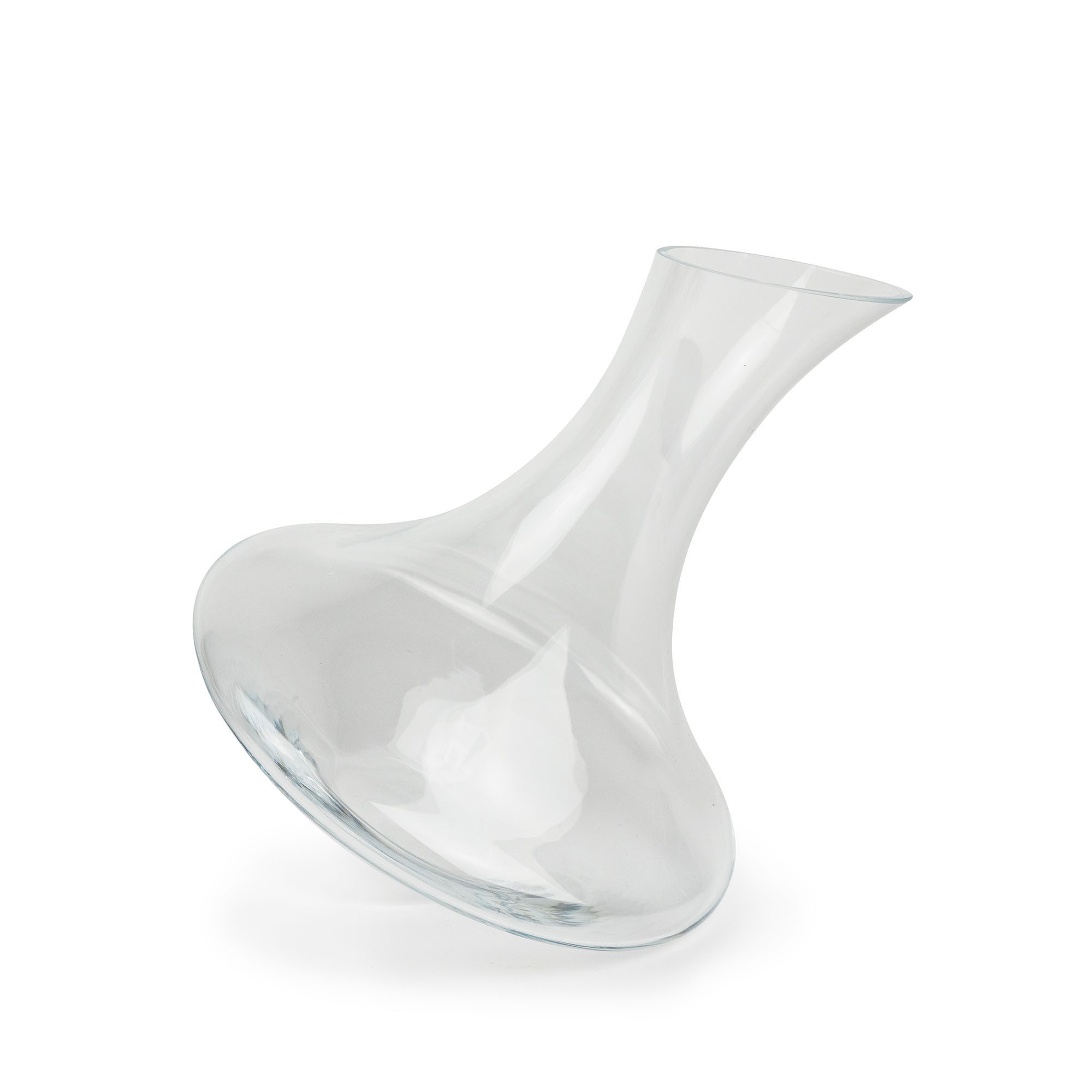 De gekantelde positie vergemakkelijkt de rotatie van de wijn in de karaf, waardoor de moleculen worden gemengd en aroma's zich kunnen ontwikkelen. De brede basis bevordert het contact tussen wijn en zuurstof.