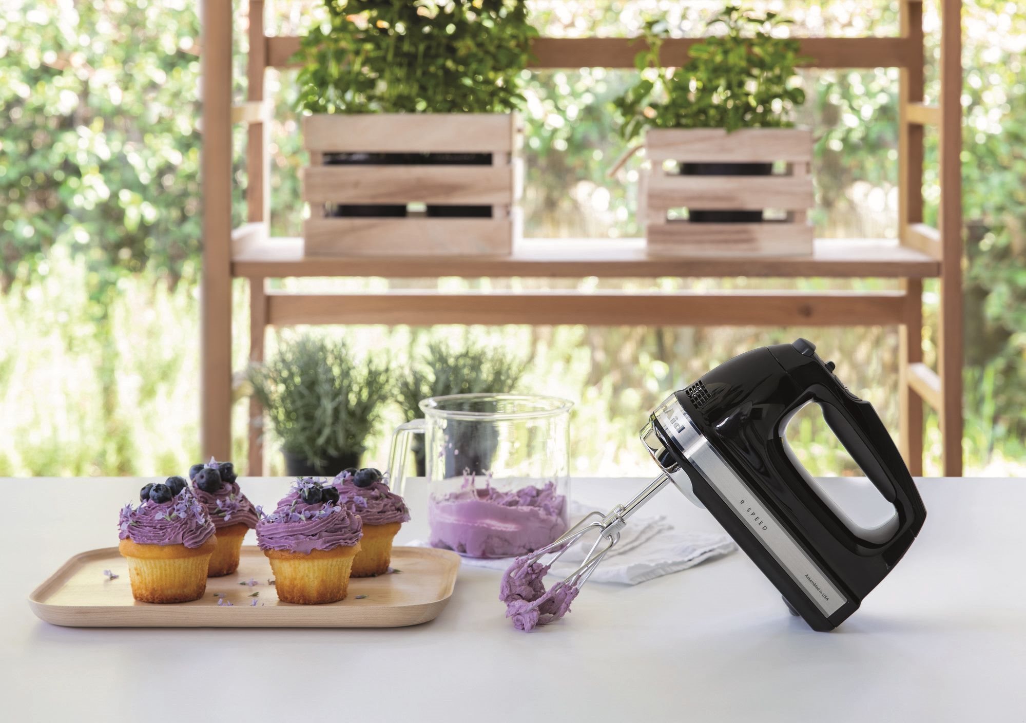 Verkrijgbaar in verschillende kleuren, met een gewicht van slechts 1,4 kg en met een ergonomische handgreep, is de handmixer licht en comfortabel genoeg om met één hand te gebruiken.