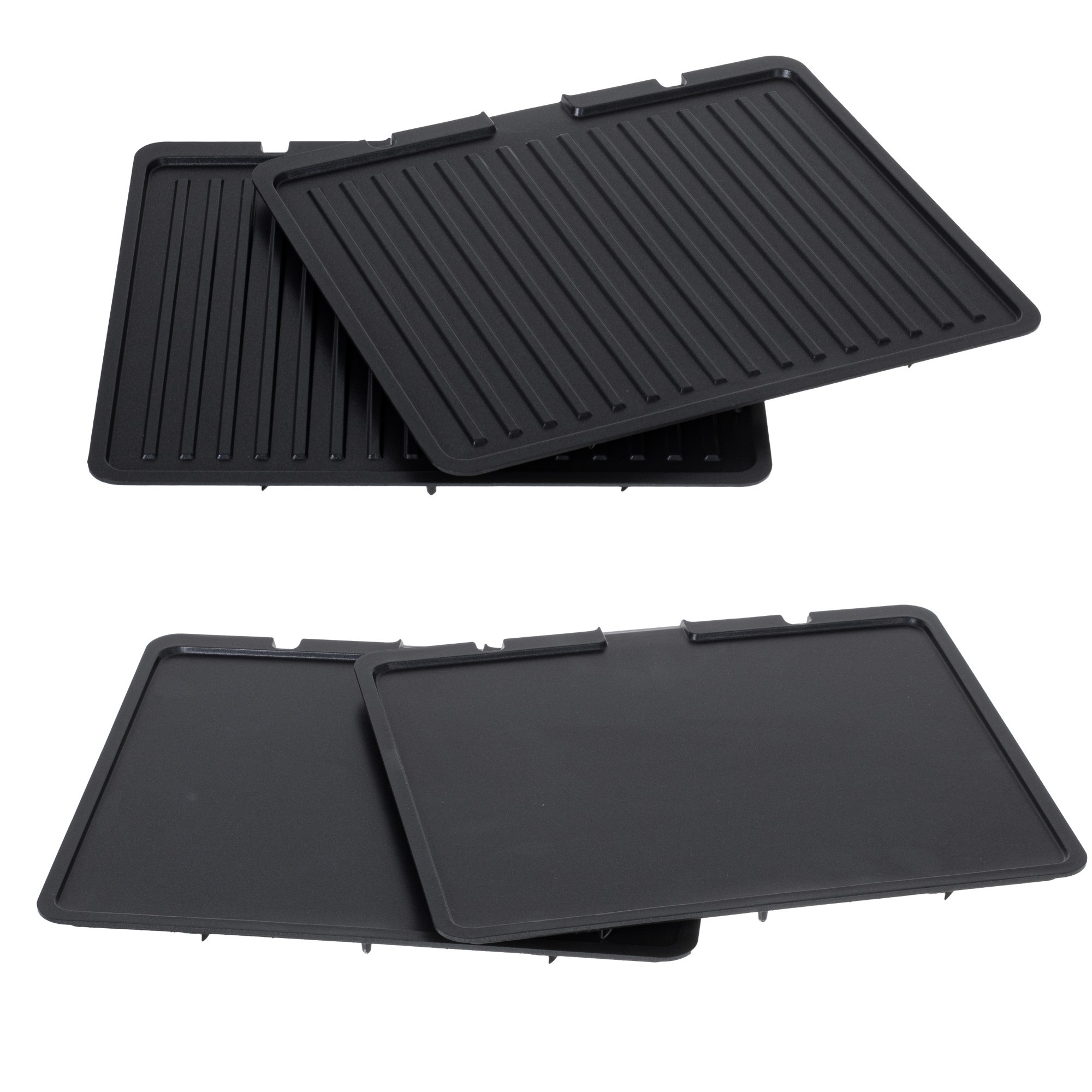 De set bevat twee soorten grillplaten: geribbeld en plat. Ze zijn bedekt met Teflon , waardoor het apparaat gemakkelijker schoon te maken is en de producten tijdens het grillen niet blijven plakken. Je kunt ze in de vaatwasser wassen, waardoor de reinigingstijd van de grill na gebruik wordt verkort.