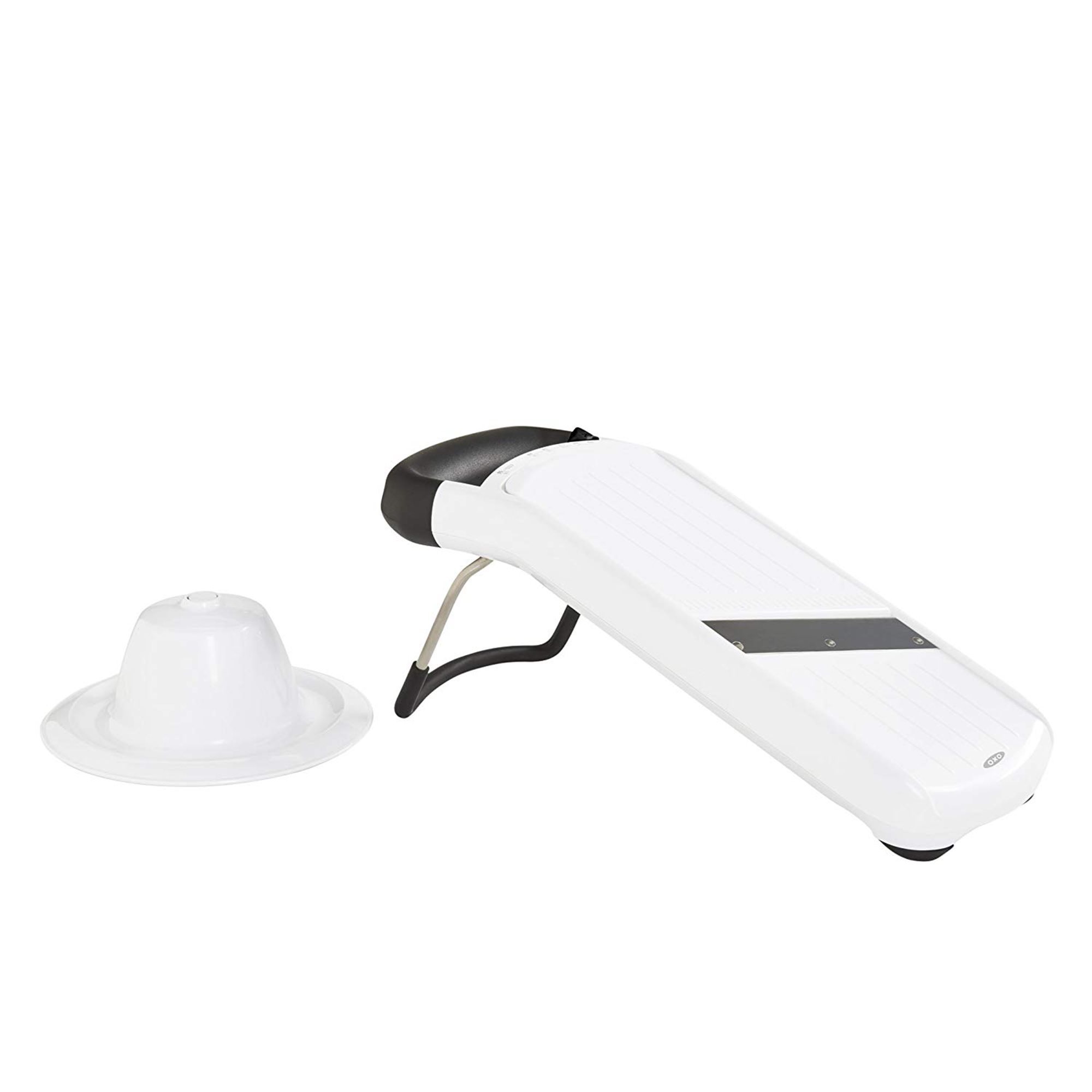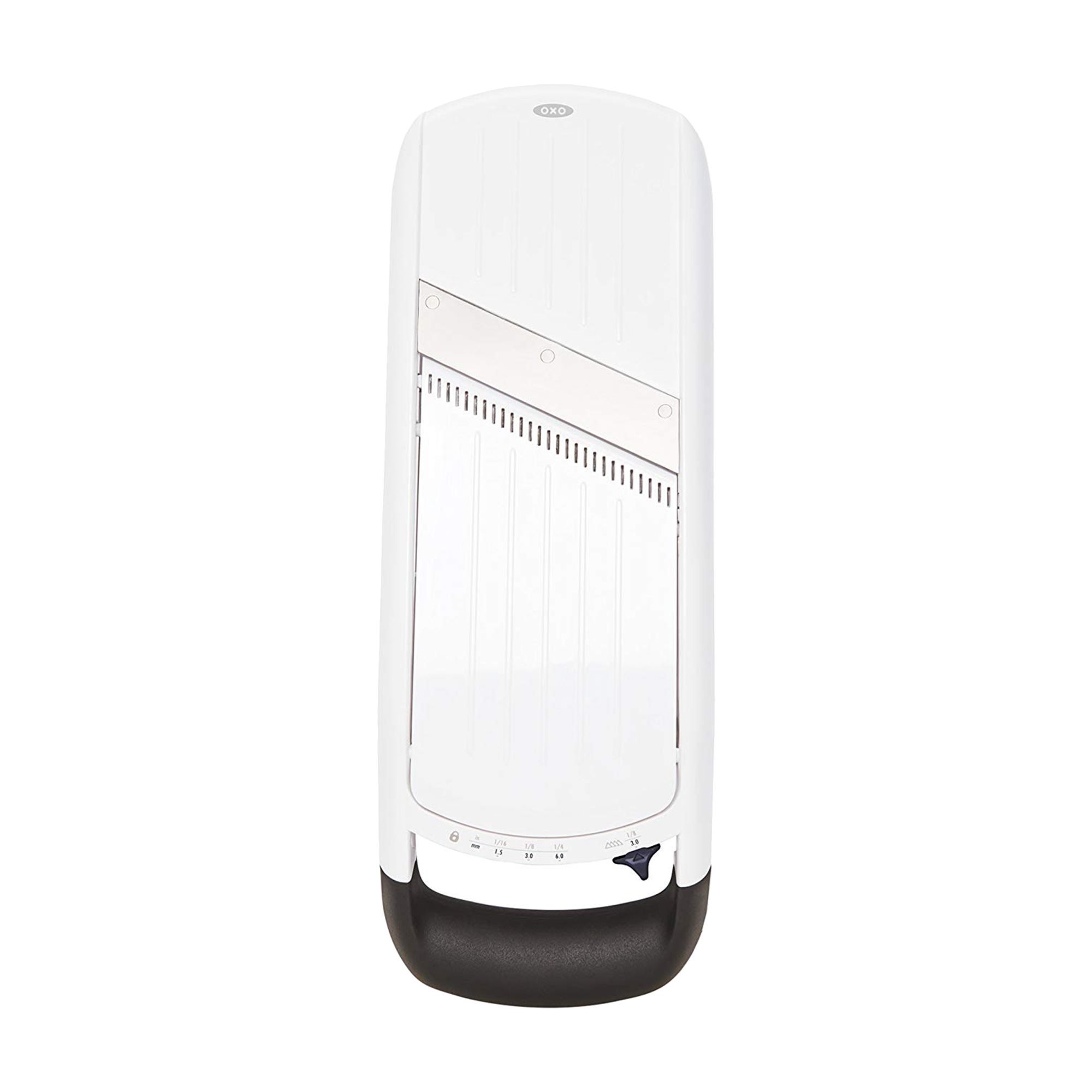 Eenvoudige mandoline, merk OXO, afmeting 35,5 x 16,45 cm, met roestvrijstalen blad.