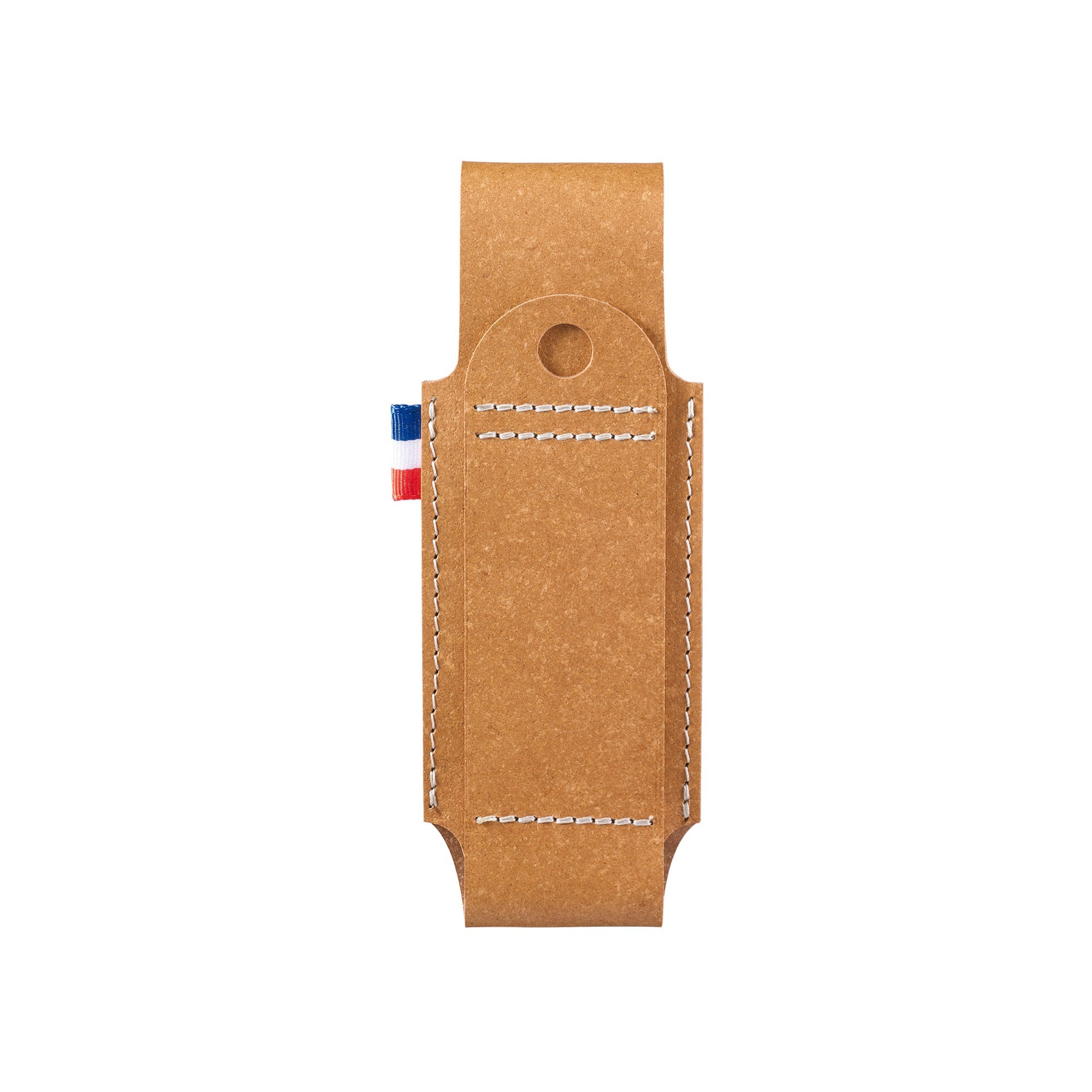 De schede, gemaakt van gerecycled leer, wordt vervaardigd in Frankrijk. Dit milieuvriendelijke materiaal is gemaakt van plantaardige stoffen en gerecyclede leervezels.