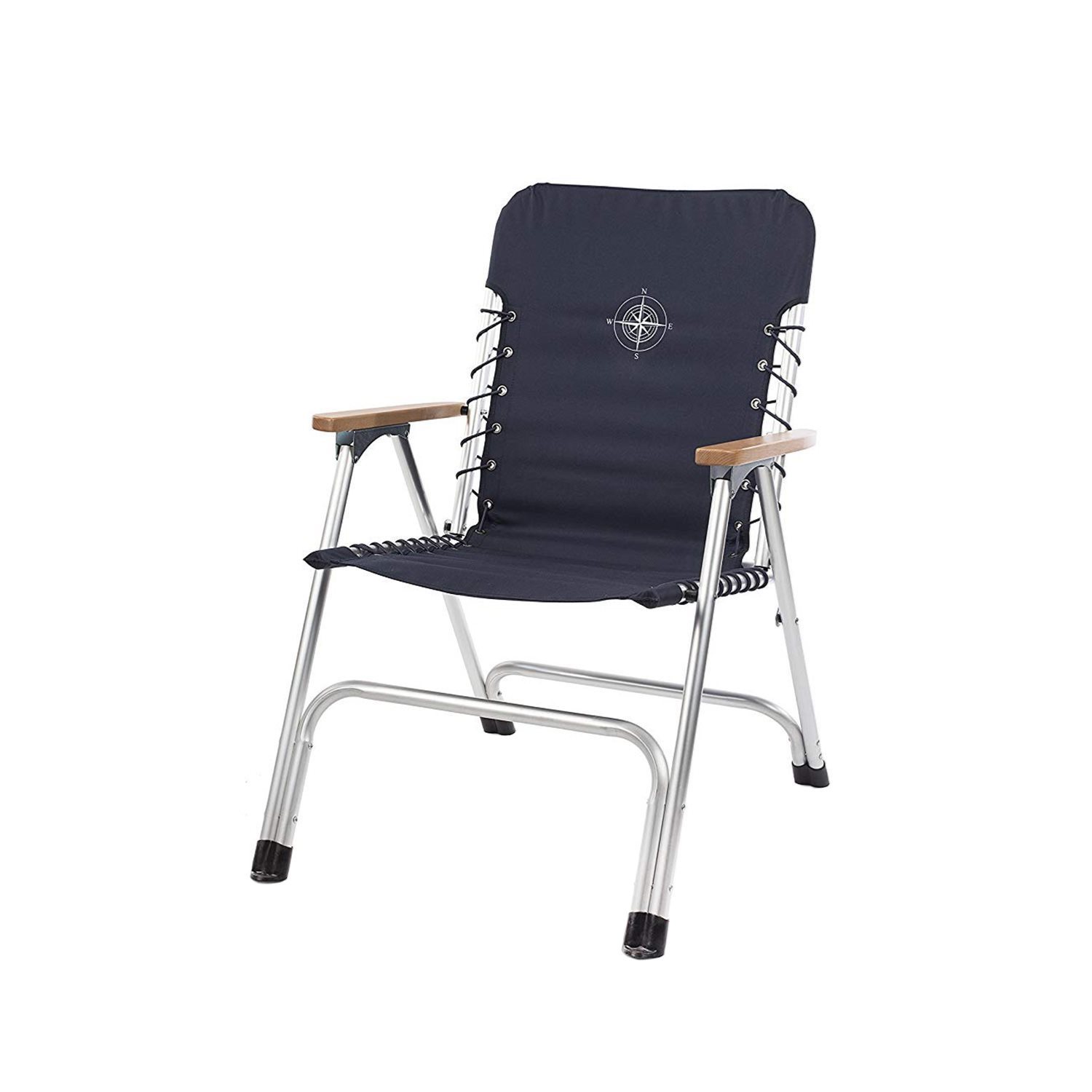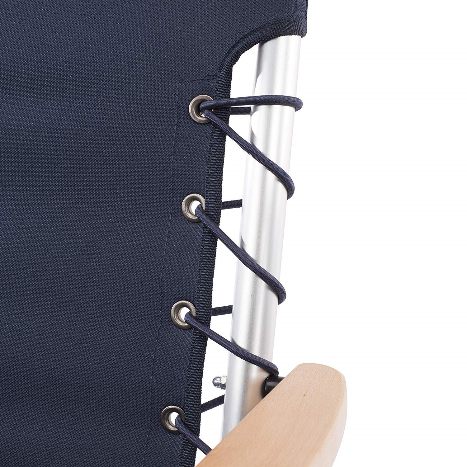 Het zitmateriaal is 600D polyester, marine kleur, en is met een elastische band aan het aluminium frame bevestigd, waardoor het de vorm van het lichaam aanneemt voor extra comfort.