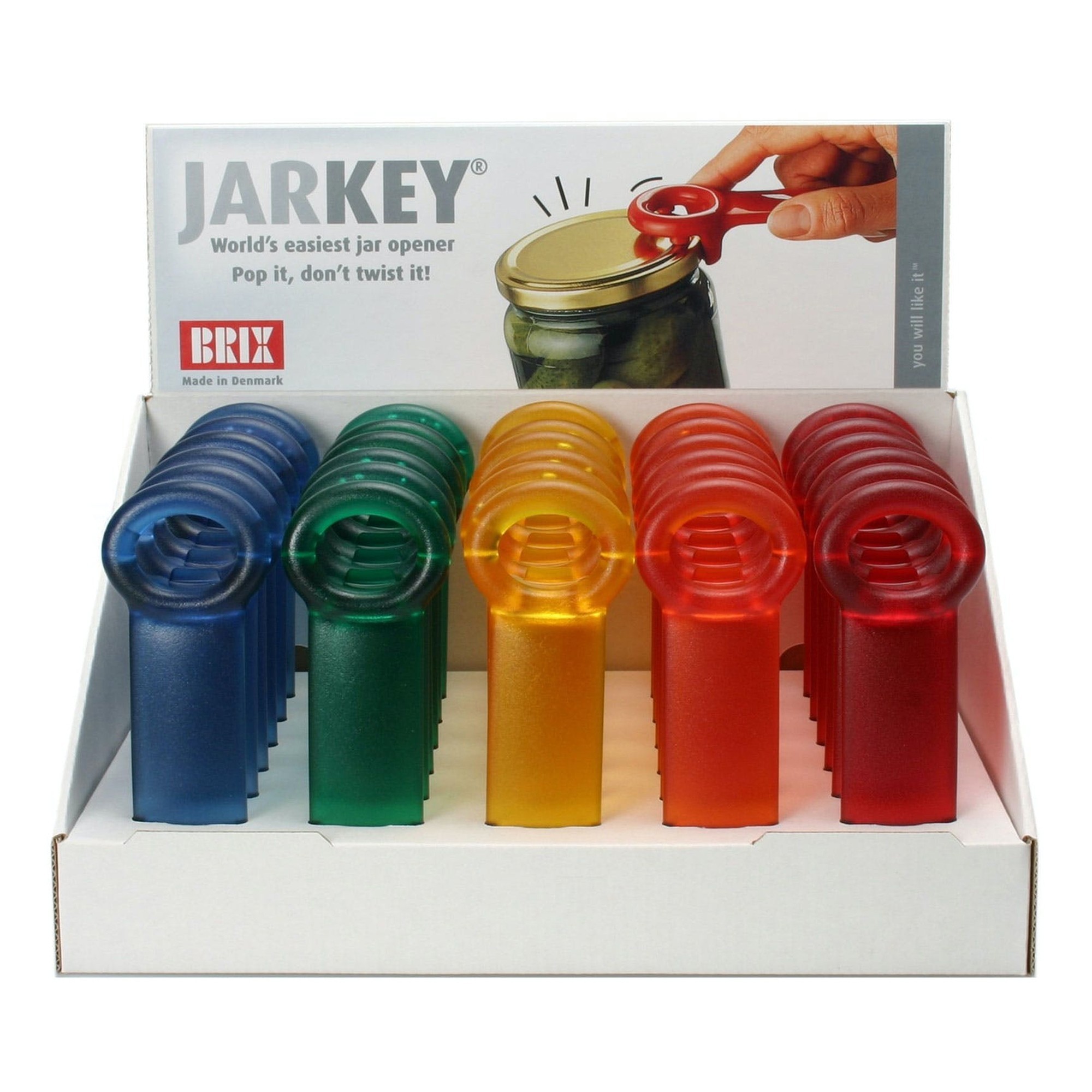 Potopener verkrijgbaar in 5 kleuren (blauw, groen, oranje, rood en violet).