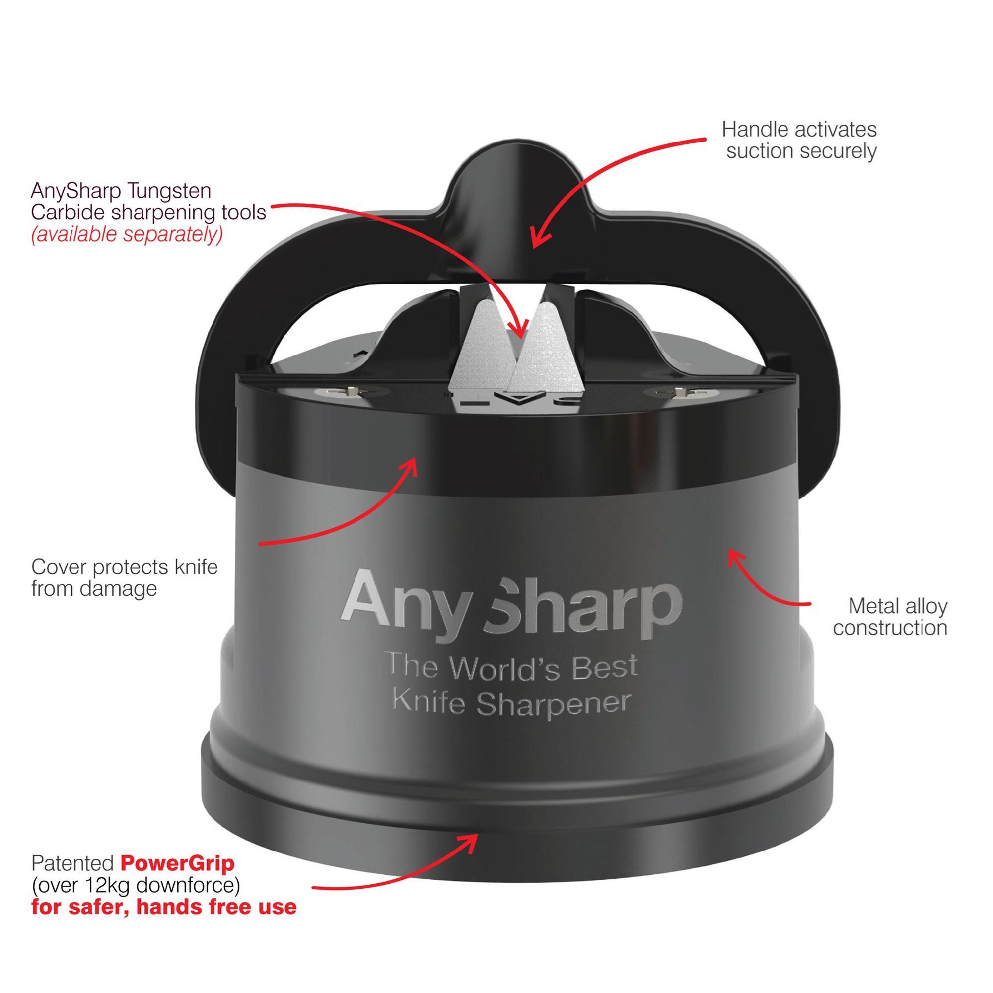 De unieke eigenschap van AnySharp is de PowerGrip-zuignap, die veilig op elk glad oppervlak of werkblad kan worden bevestigd zonder dat er ander gereedschap nodig is.
