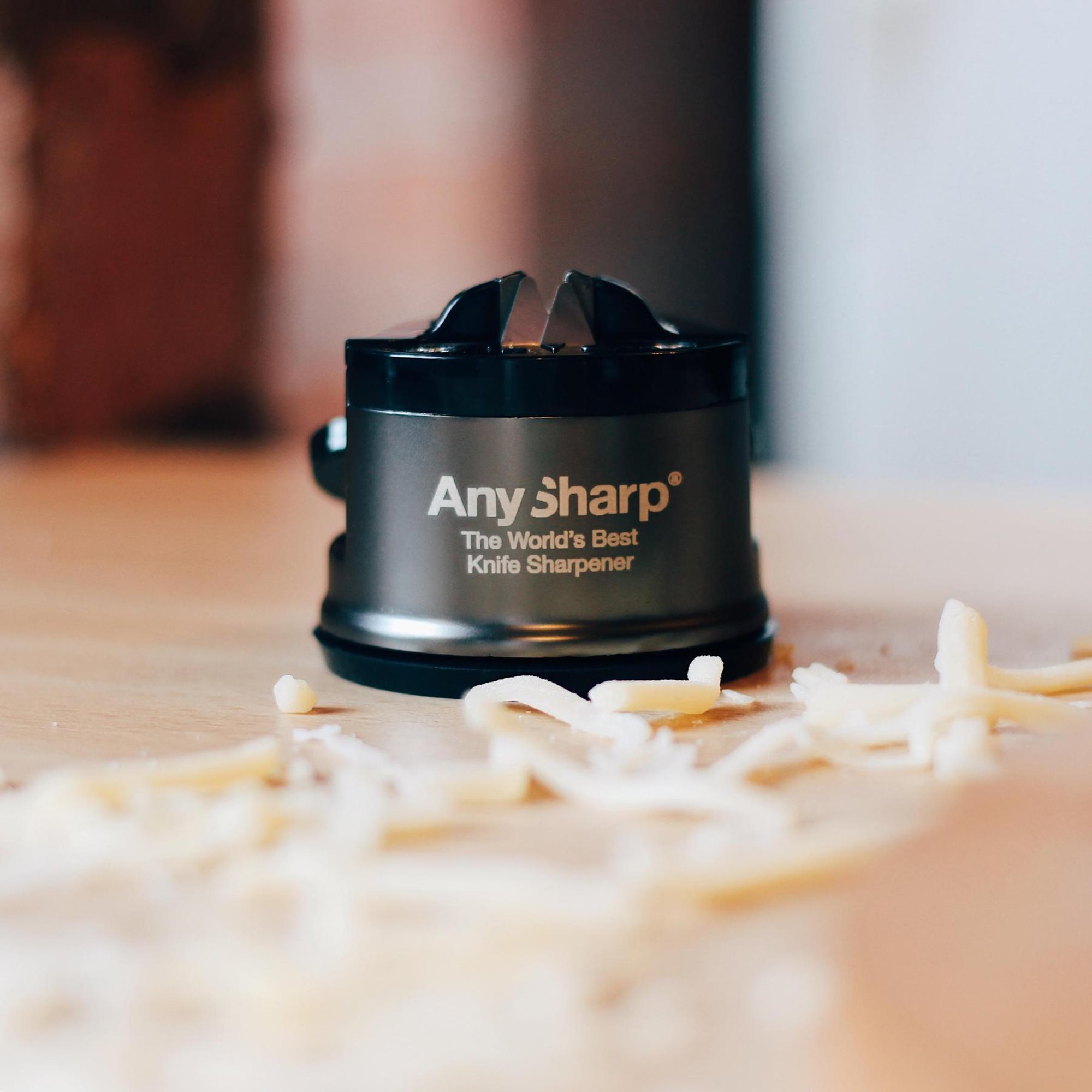 De AnySharp-slijper slijpt het mes in een perfecte hoek en verwijdert overtollig metaal snel vanaf het eerste gebruik. Als het mes eenmaal is geslepen, worden betere resultaten behaald door slechts lichte druk uit te oefenen en worden alleen microscopisch kleine hoeveelheden metaal afgeworpen.