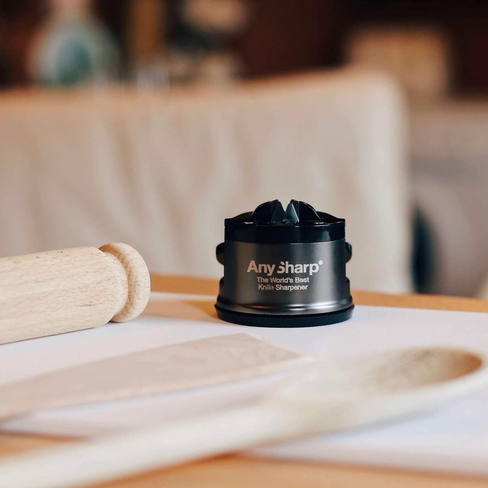 De Pro - messenslijper van het merk AnySharp is ideaal voor elk type keukenmes met een recht lemmet of met grote inkepingen.