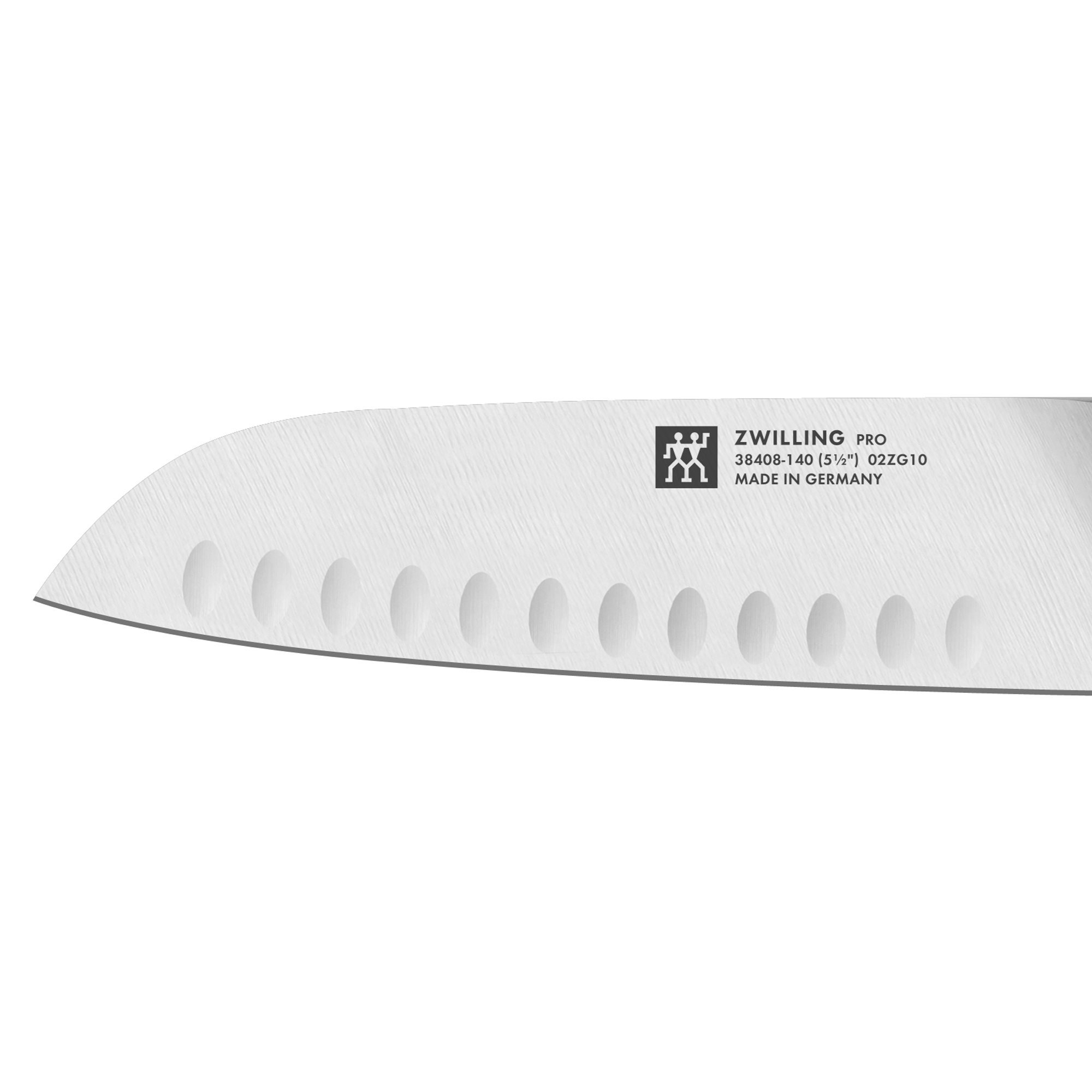 Santoku mes, merk Zwilling, met een 14 cm lang lemmet gemaakt van speciaal roestvrij staal in overeenstemming met de hoogste normen, lemmet dat corrosiebestendig en schokbestendig is.