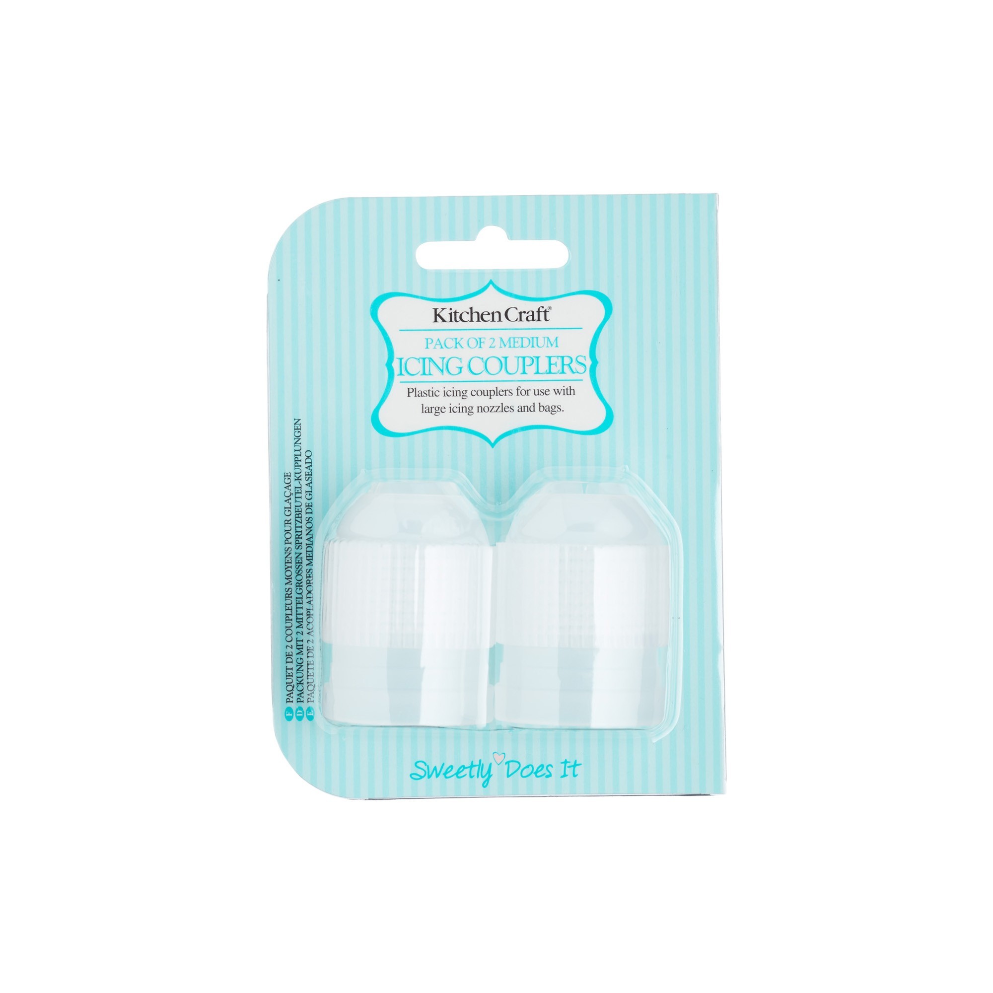 Set van 2 uiteinden voor het bevestigen van nozzles voor decoratie, van het merk Kitchen Craft met een lengte van 2,5 cm, gemaakt van plastic. Deze producten helpen u bij het gebruik van verschillende spuitmonden met een andere punt zonder dat u de deegzak hoeft te vervangen voor decoratie.