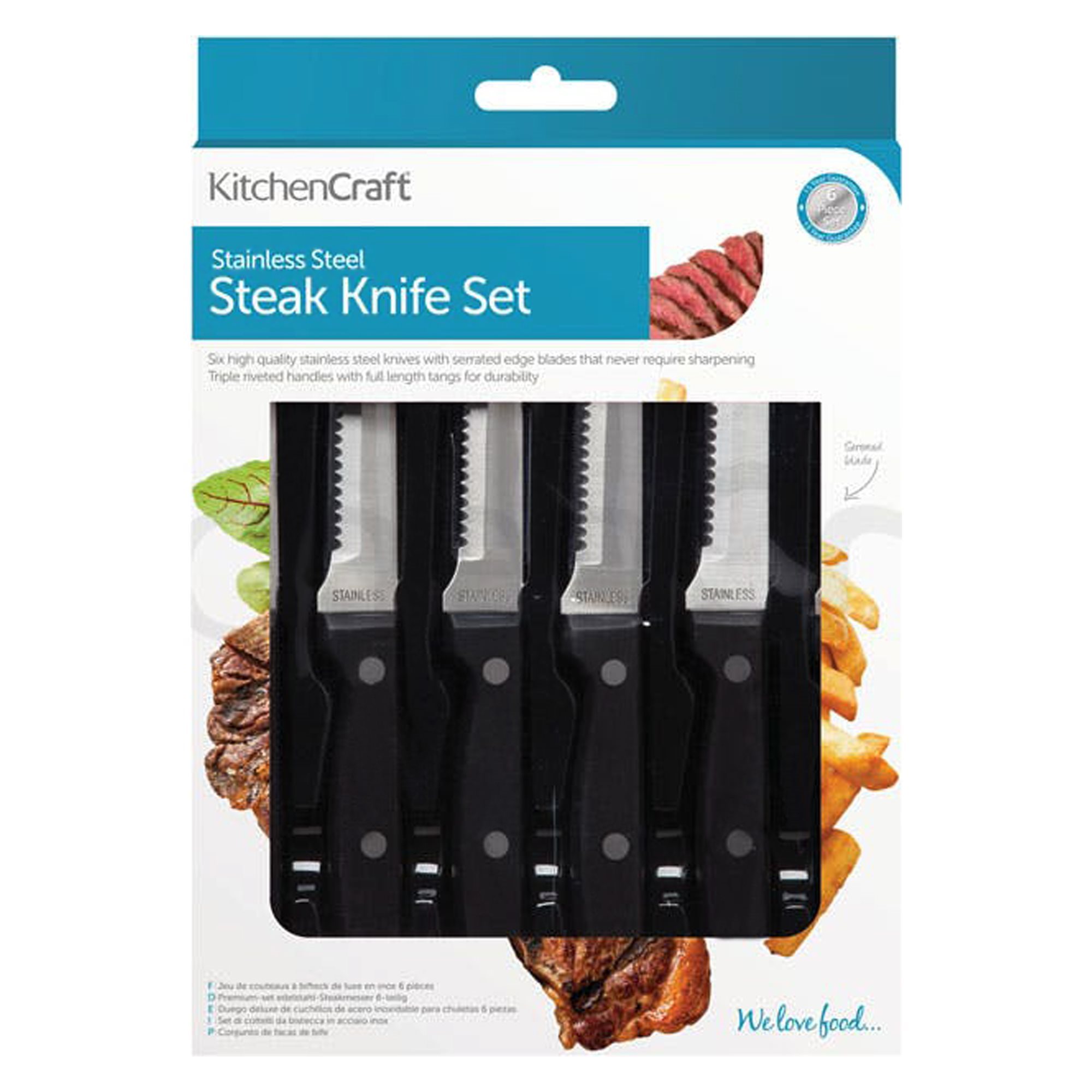 Set van 6 messen voor biefstuk, Kitchen Craft merk, gemaakt van roestvrij staal, met gekartelde messen. Elk mes heeft een lengte van 21,5 cm.