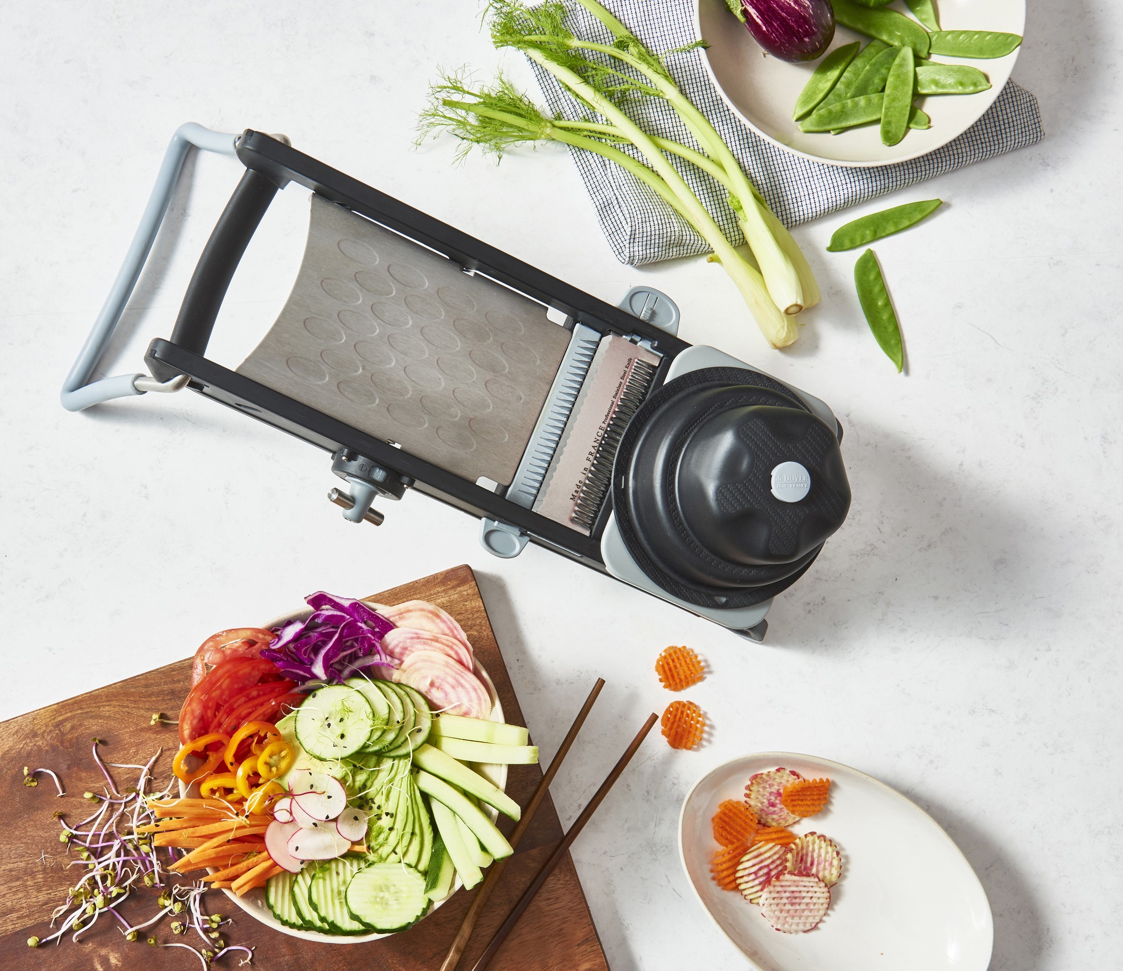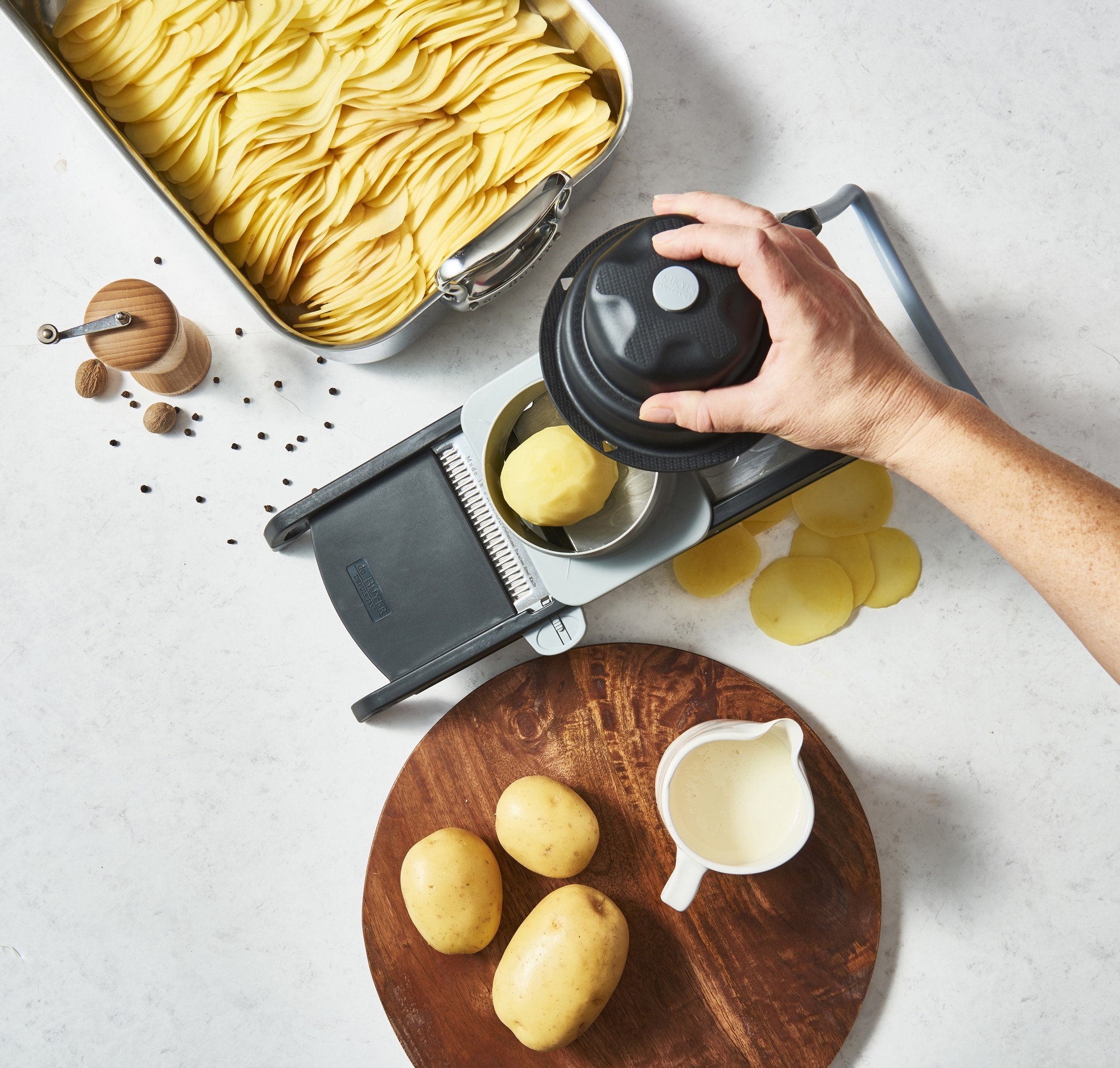 De plakdikte kan eenvoudig worden aangepast met behulp van het bedieningswiel, dat zich aan de zijkant van de mandoline bevindt. Hiermee stel je de plakdikte in tussen 0,5 mm en 10 mm.