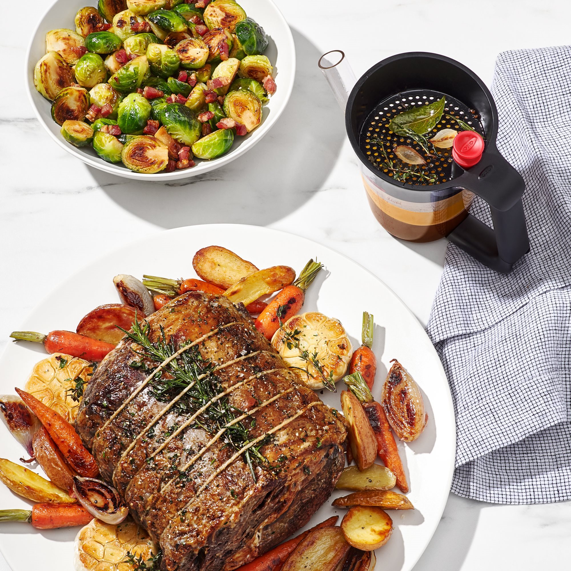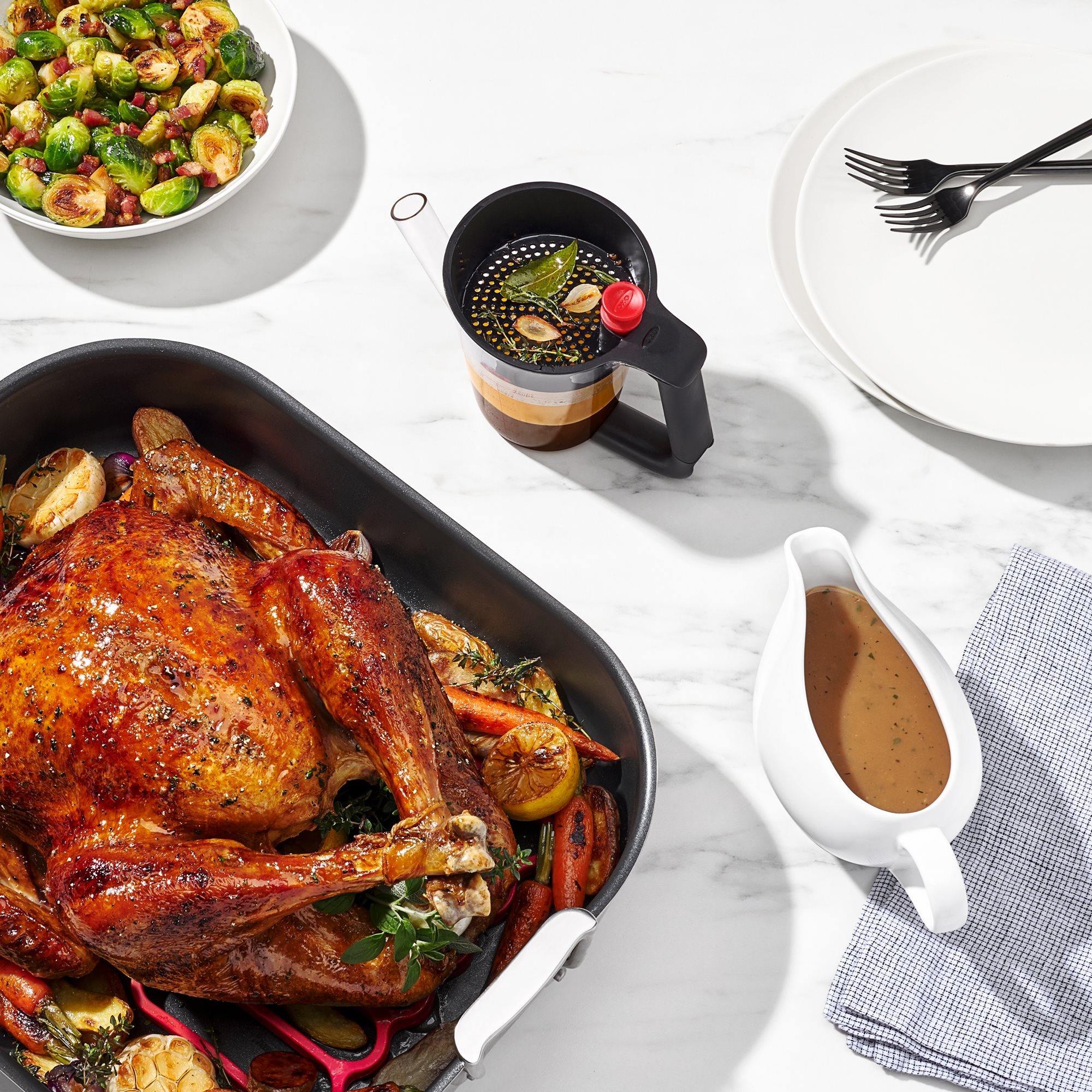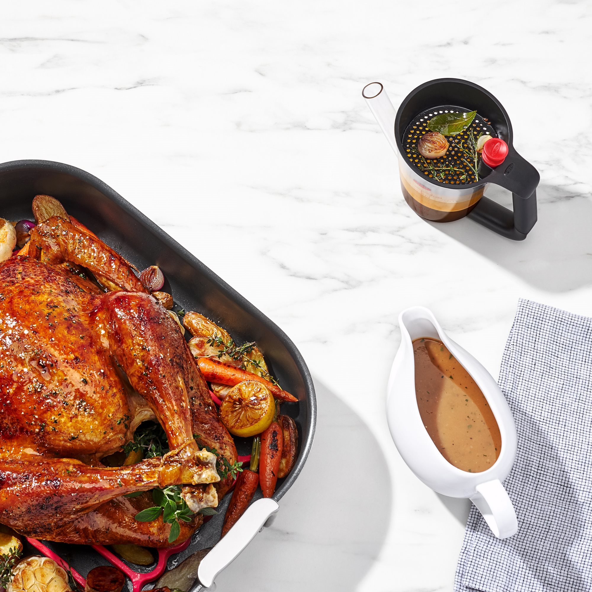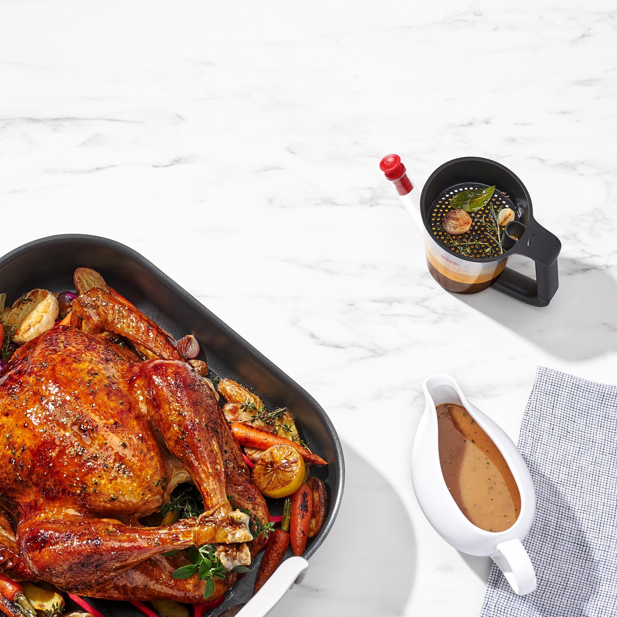 De container is ideaal voor het scheiden van vet en het serveren van sauzen. Zet gewoon de stop in de tuit en als je de saus schenkt, scheidt de zeef de ongewenste stukjes en blijft het vet erop zitten. Verwijder de stop en giet het erin, en de aromatische kookvloeistof zal zich scheiden en het vet in de container achterlaten. De maatmarkeringen helpen om de recepten te volgen en de hoge rand helpt spatten tijdens het schenken te voorkomen.