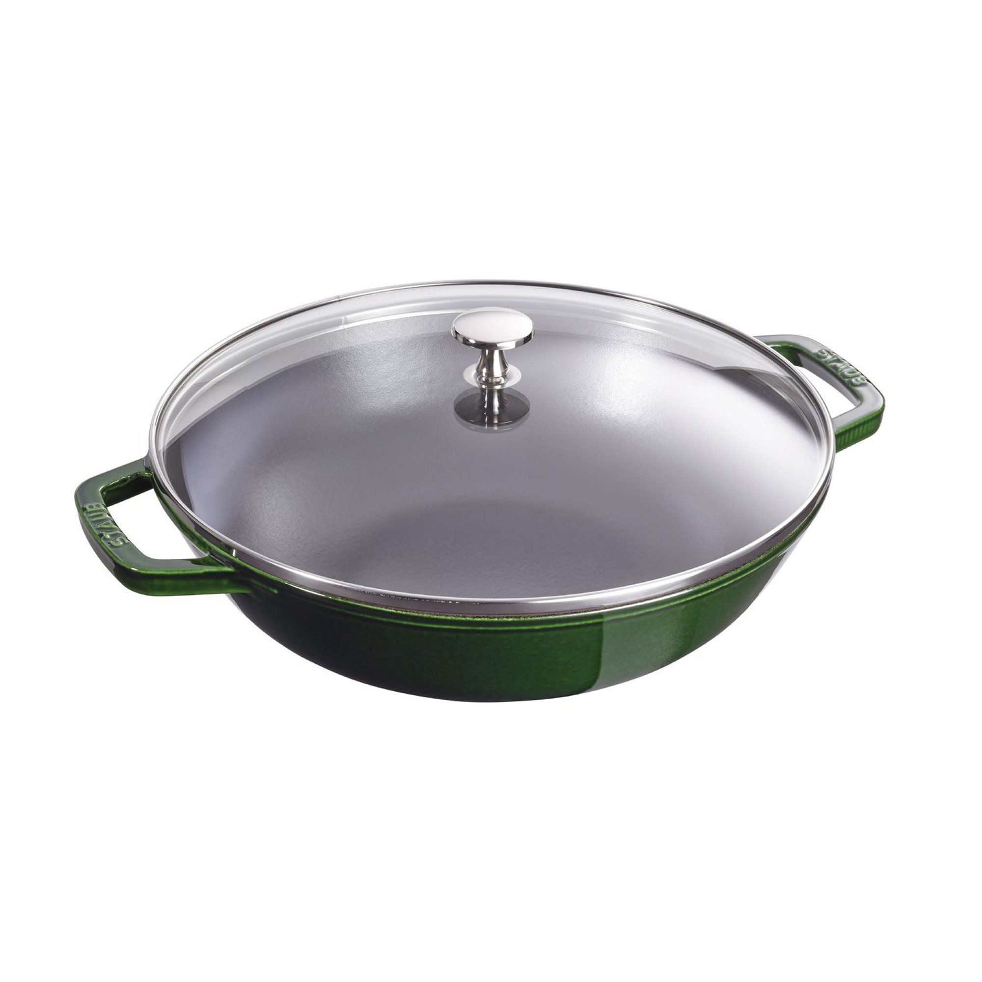 Wokpan, merk Staub, 30 cm diameter, gemaakt van gietijzer en voorzien van deksel van hittebestendig glas.
