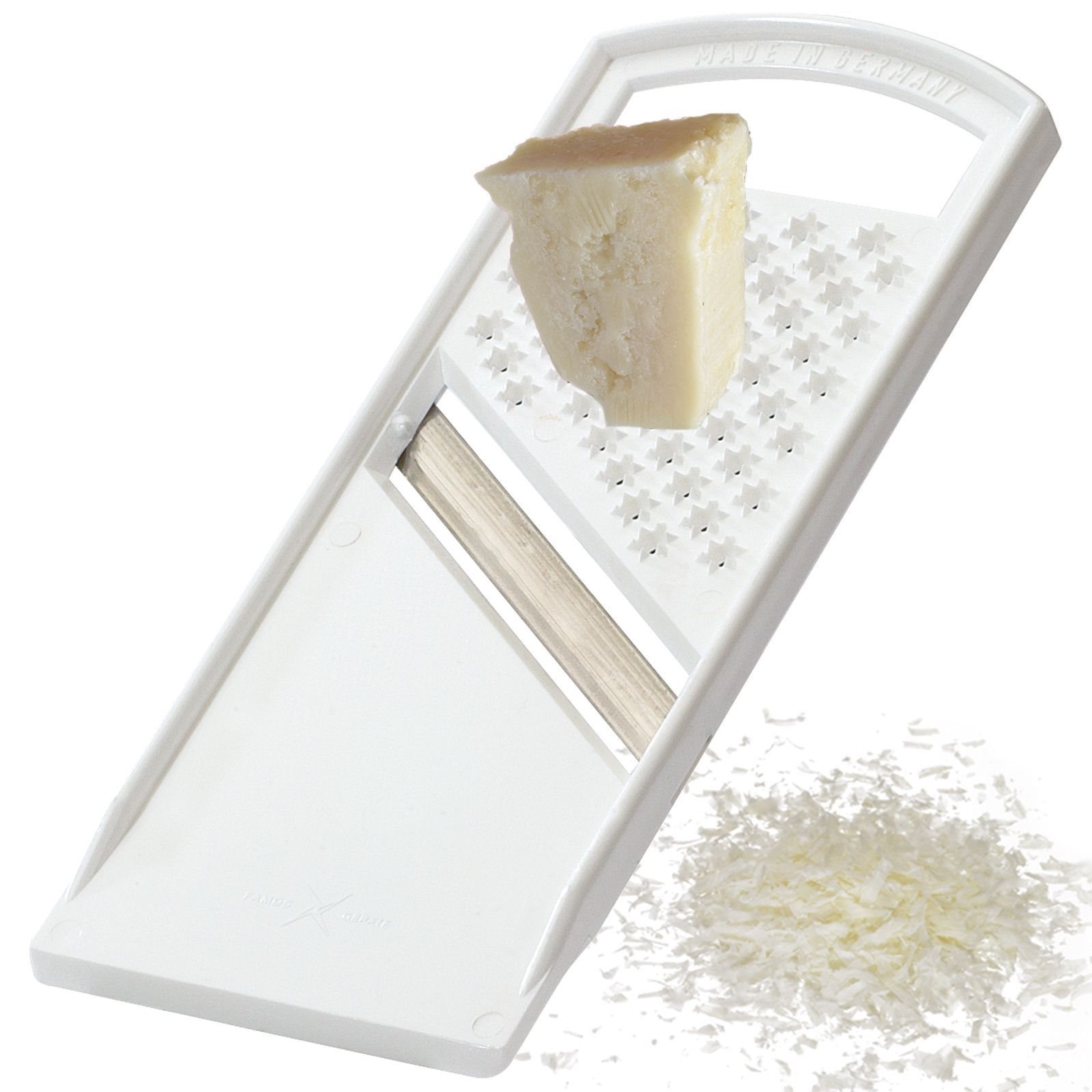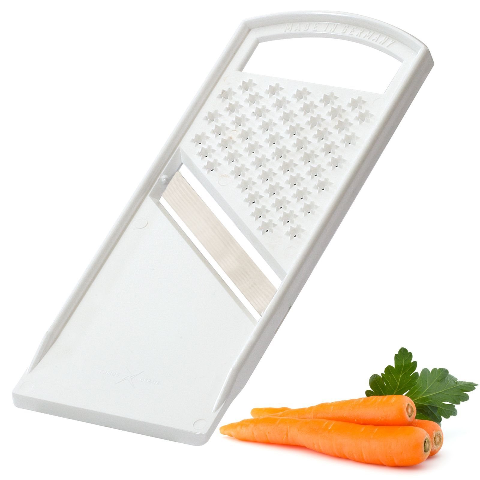 Vegetabilsk slicer-rivjern produsert av Westmark, dimensjoner 18 × 7 cm , laget av plast, med et rustfritt stålblad.