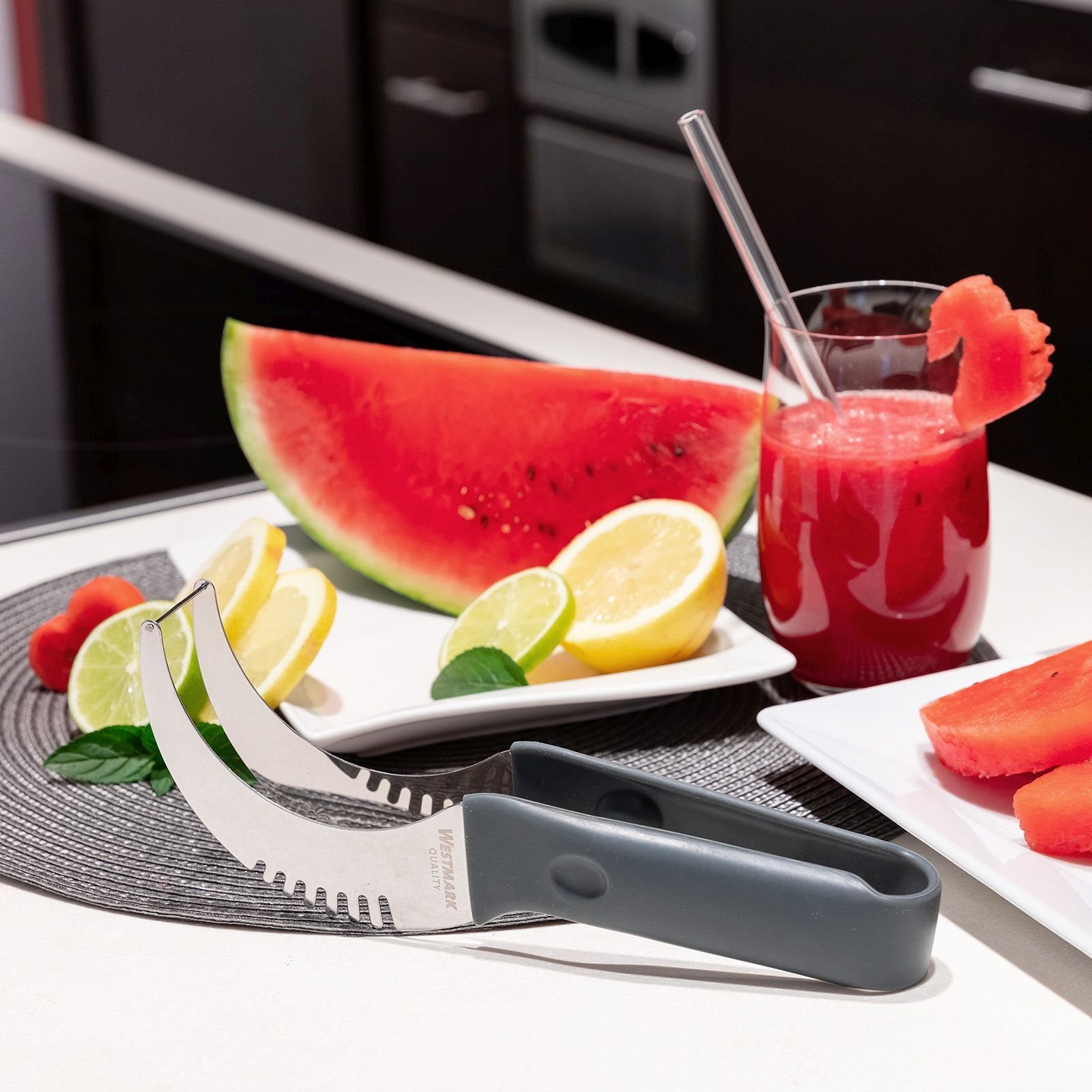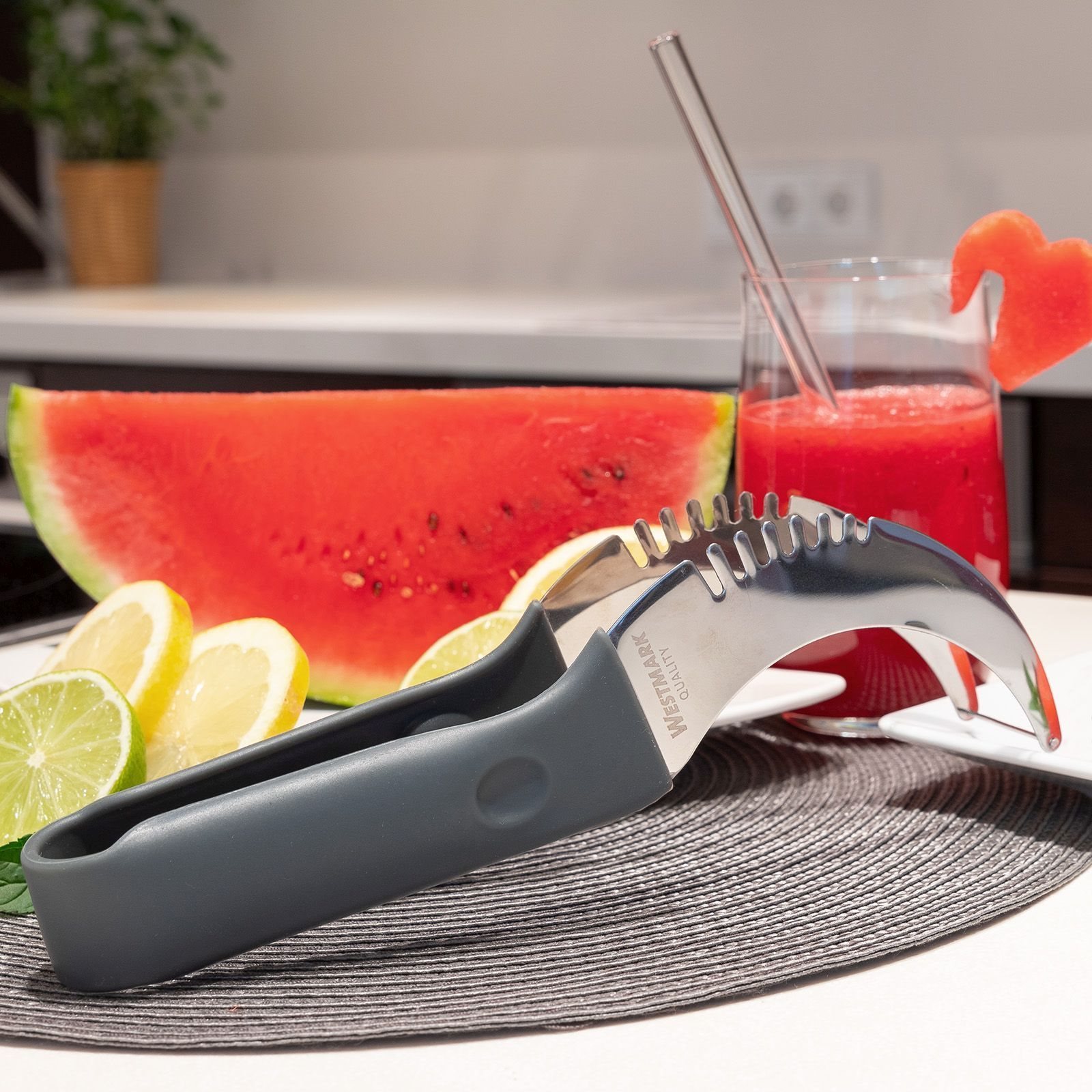 Feliator pentru pepene "Hook", marca Westmark, cu dimensiunile 23,5 x 3,8 x 6,8 cm, fabricat din otel inoxidabil si cu maner ergonomic din silicon.