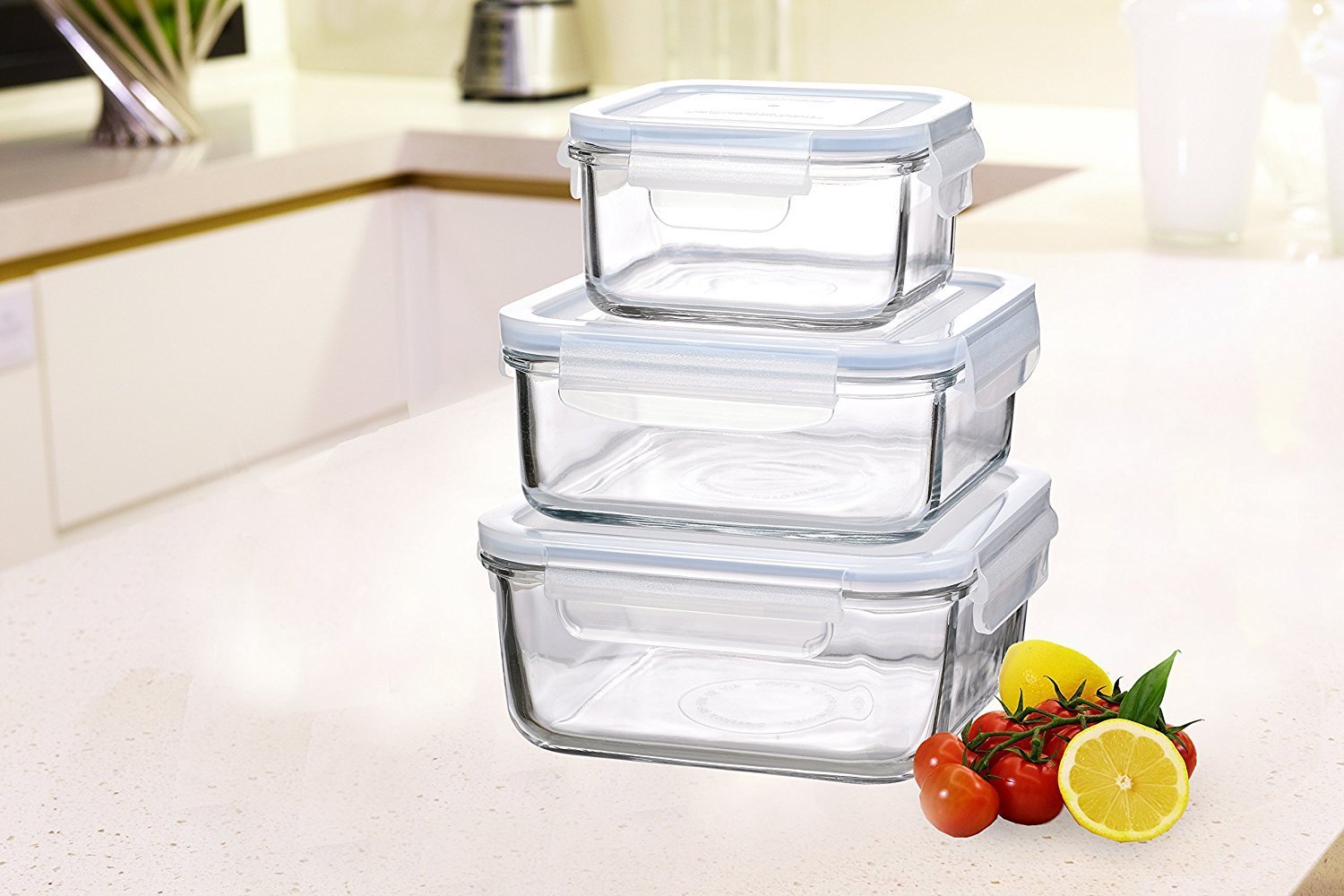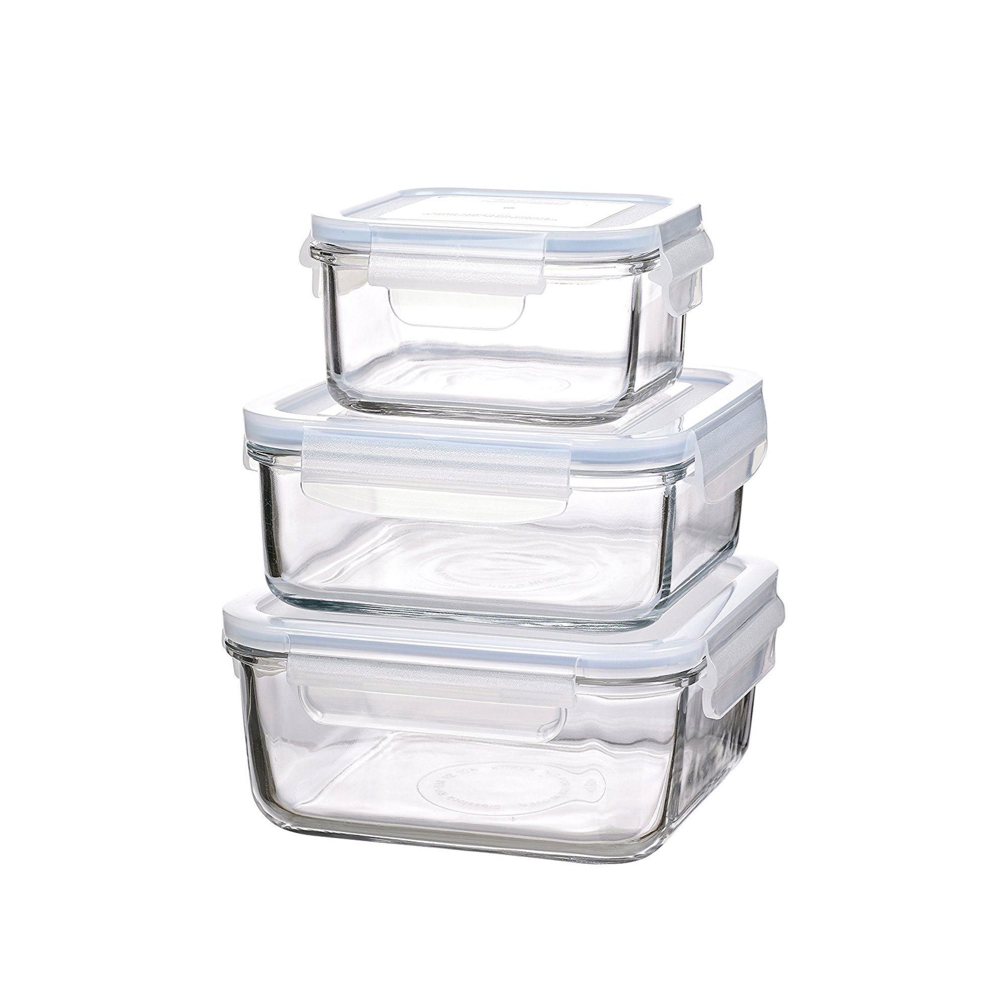 Set 3 caserole patrate cu capac marca Glasslock din sticla speciala, rezistenta la temperaturi intre -20 si +120°C.